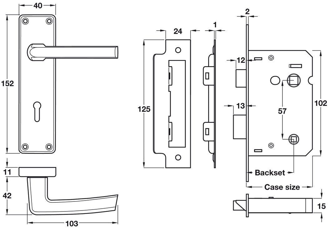 - Supplied with: 2x Hinges, 76 mm, zinc plated1x Mortice bathroom lock, 64 mm, nickel plated1x Lever bathroom handle, satin aluminium