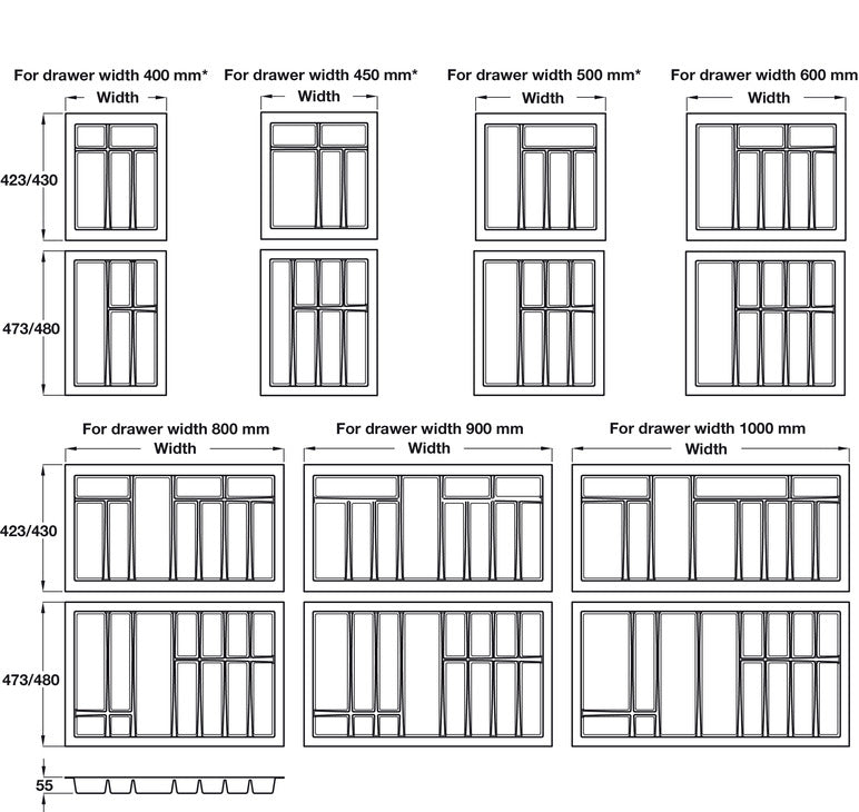 - Note: For Blum: Width = Cabinet width - 86 mmWidth dimension does NOT include sealing stripSpice jar and knife block inserts are not suitable for use in inserts for 400, 450 or 500 mm cabinet widths