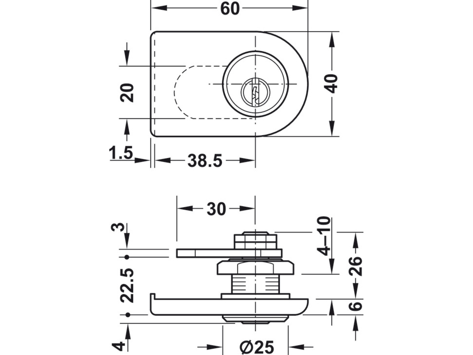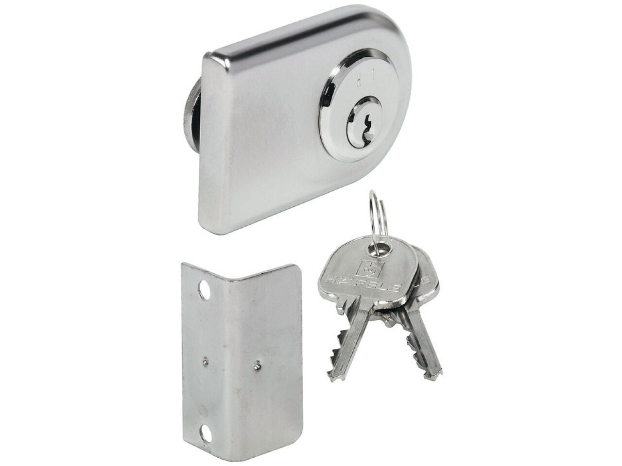 Supplied with 1 Glass door cam lock2 Keys1 Locking cam3 Hexagon nuts1 Clamping plate1 Clamping rosette1 Angled striking plate