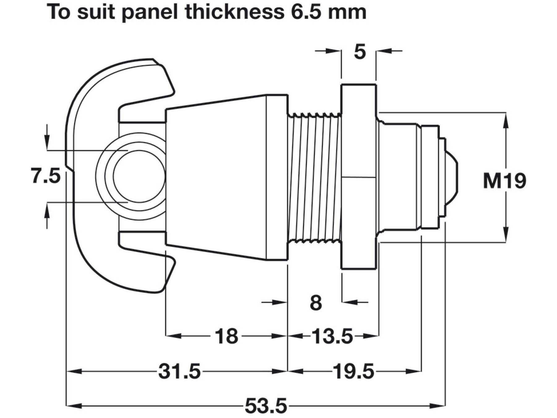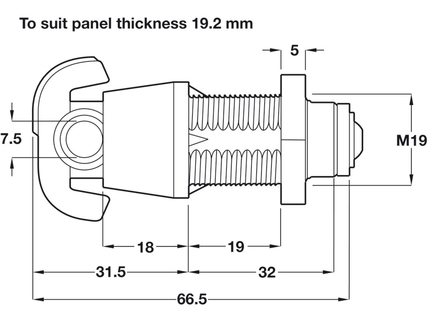 To suit panel thickness 6.5, 12.2 or 19.2 mmTo suit ⌀ 5-7 mm shackle1/4 rotation camlock to the right