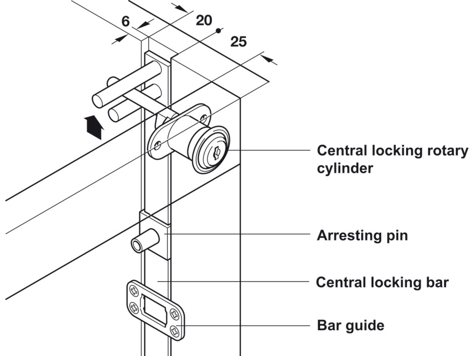 When the cylinder is locked by 180°, the lifting pin turns upwards and pulls the central locking bar upwards by the travel into the lock.