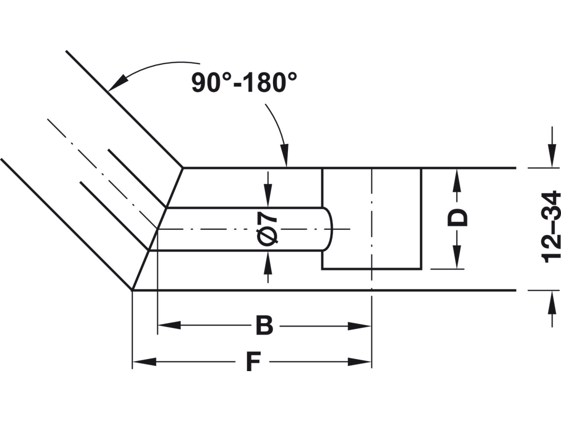 The inset distances F in mm in the following table apply to mitre-joint connecting bolts with a drilling dimension B of 44 mm. 20 mm must be deducted from the specified inset distances F for drilling dimension B of 24 mm. The dimension for drilling depth D corresponds to the drilling depth D of the Minifix® connector housing that is used.