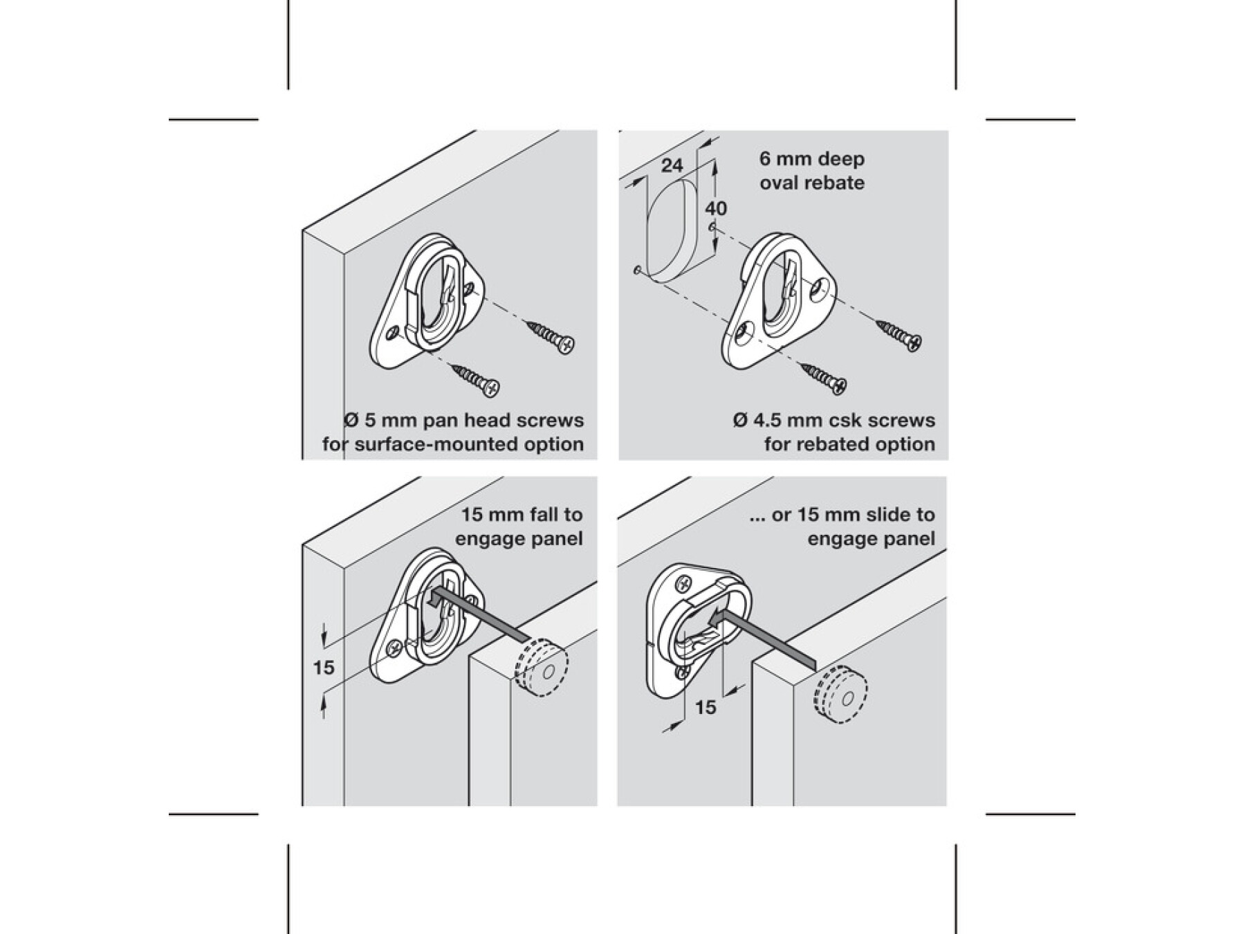 Engage the buttons in the connector and slide the panel down by 15 mm until button-fixTM goes ‘click’, can also be configured sideways