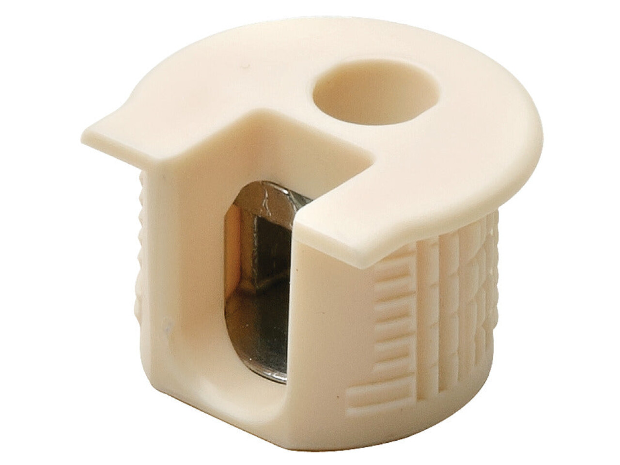 With tightening element, Without ridge, for wood thickness from 19 mm, dim. A: 9.5 mm, drilling depth X 14.2+0.2, beige