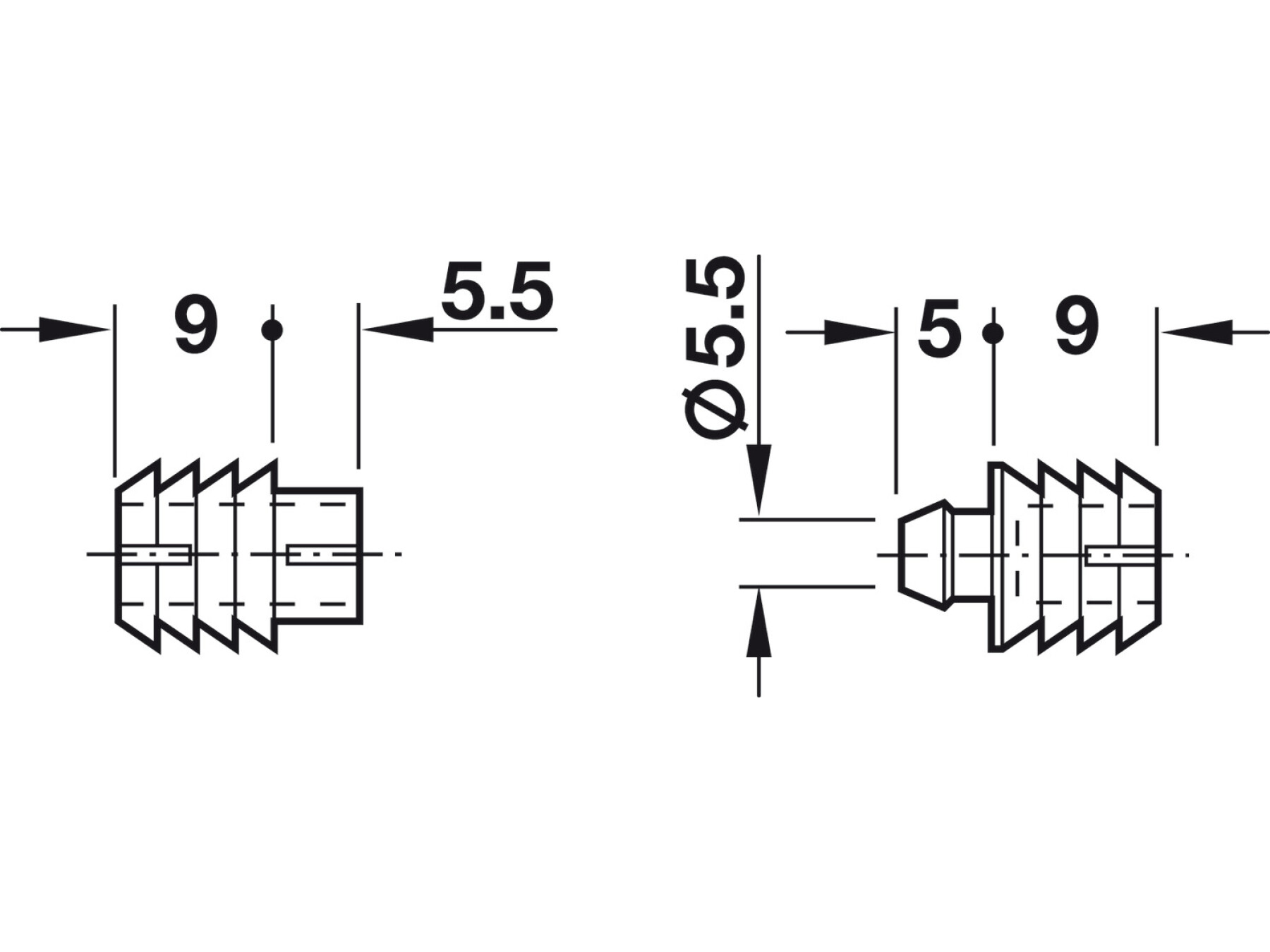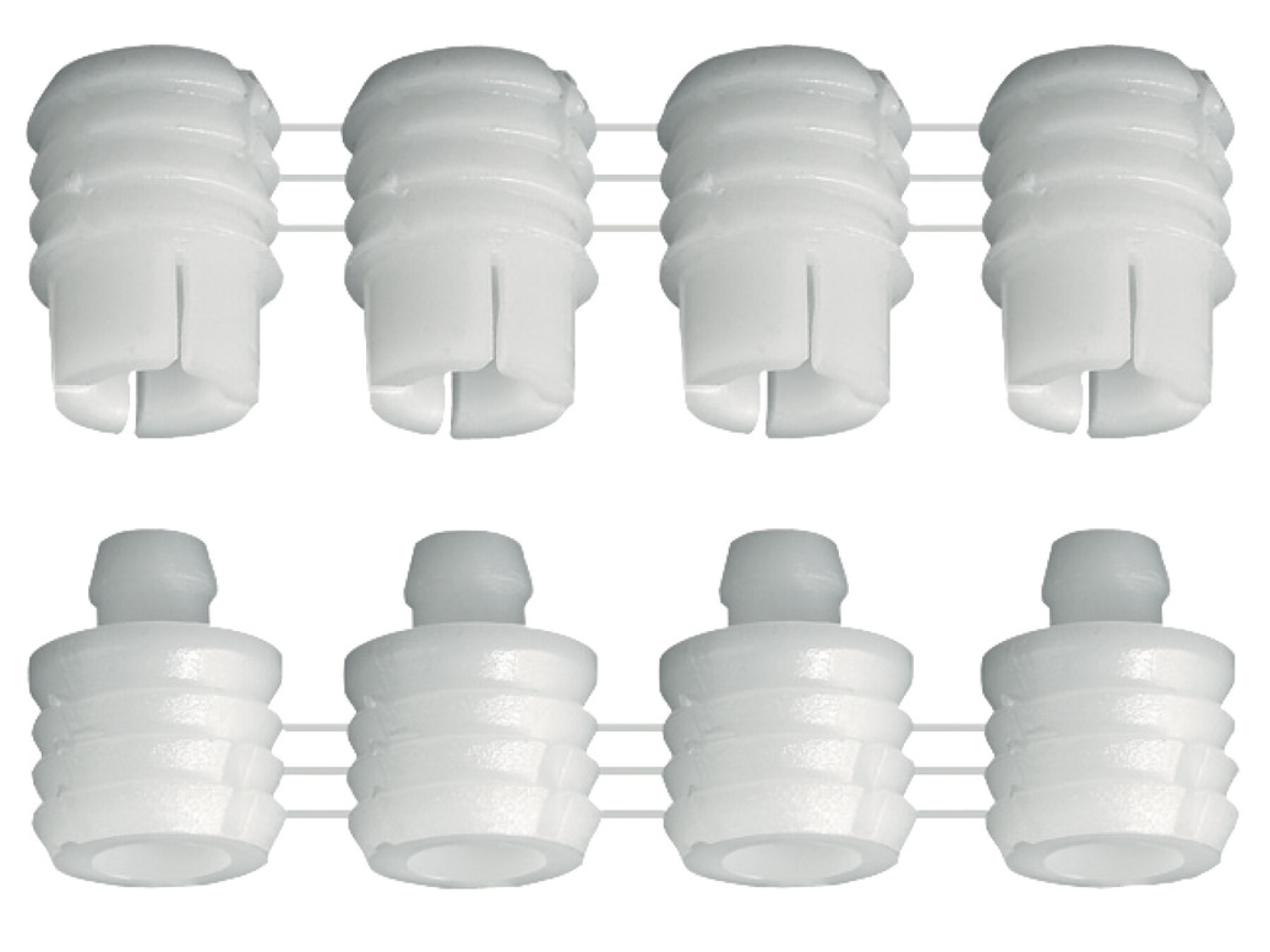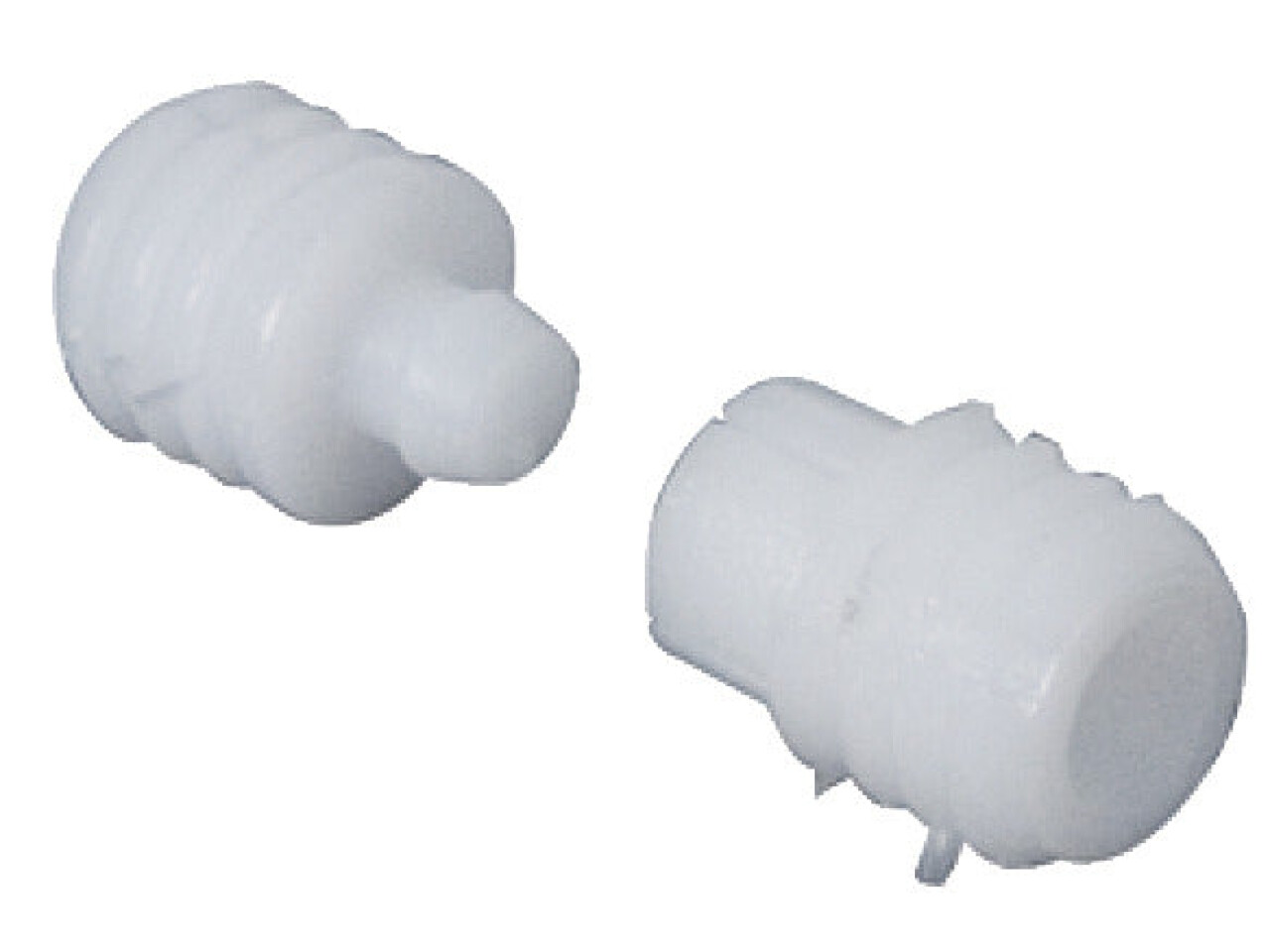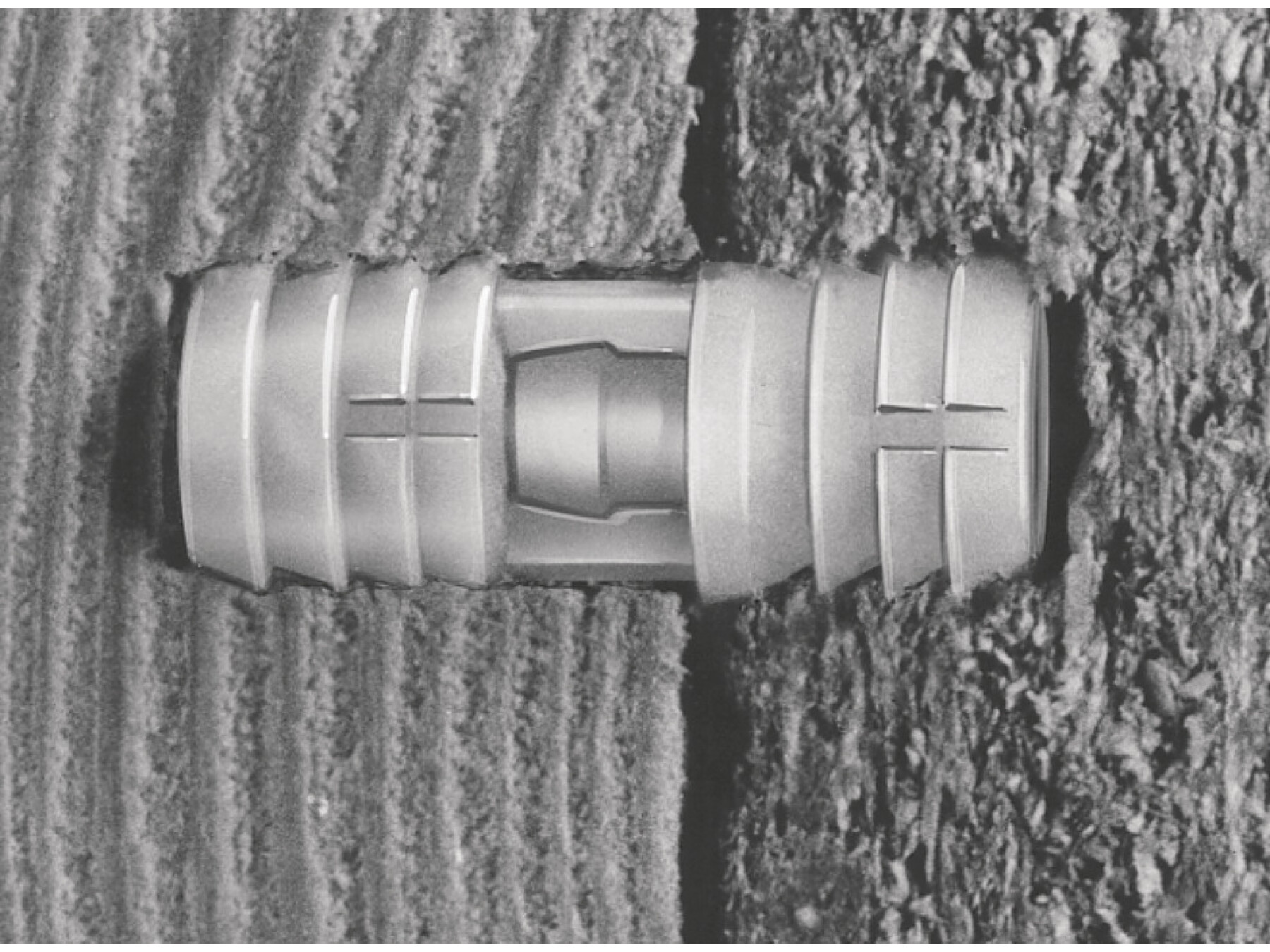 Female element has four slots, male element incorporates a tapered plug which locks into position, ensuring a secure seat in the material and a strong joint
