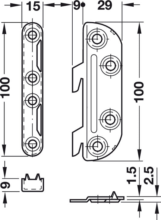 - Width: Strike plate 15 mm, hook in plate 29 mm including hook