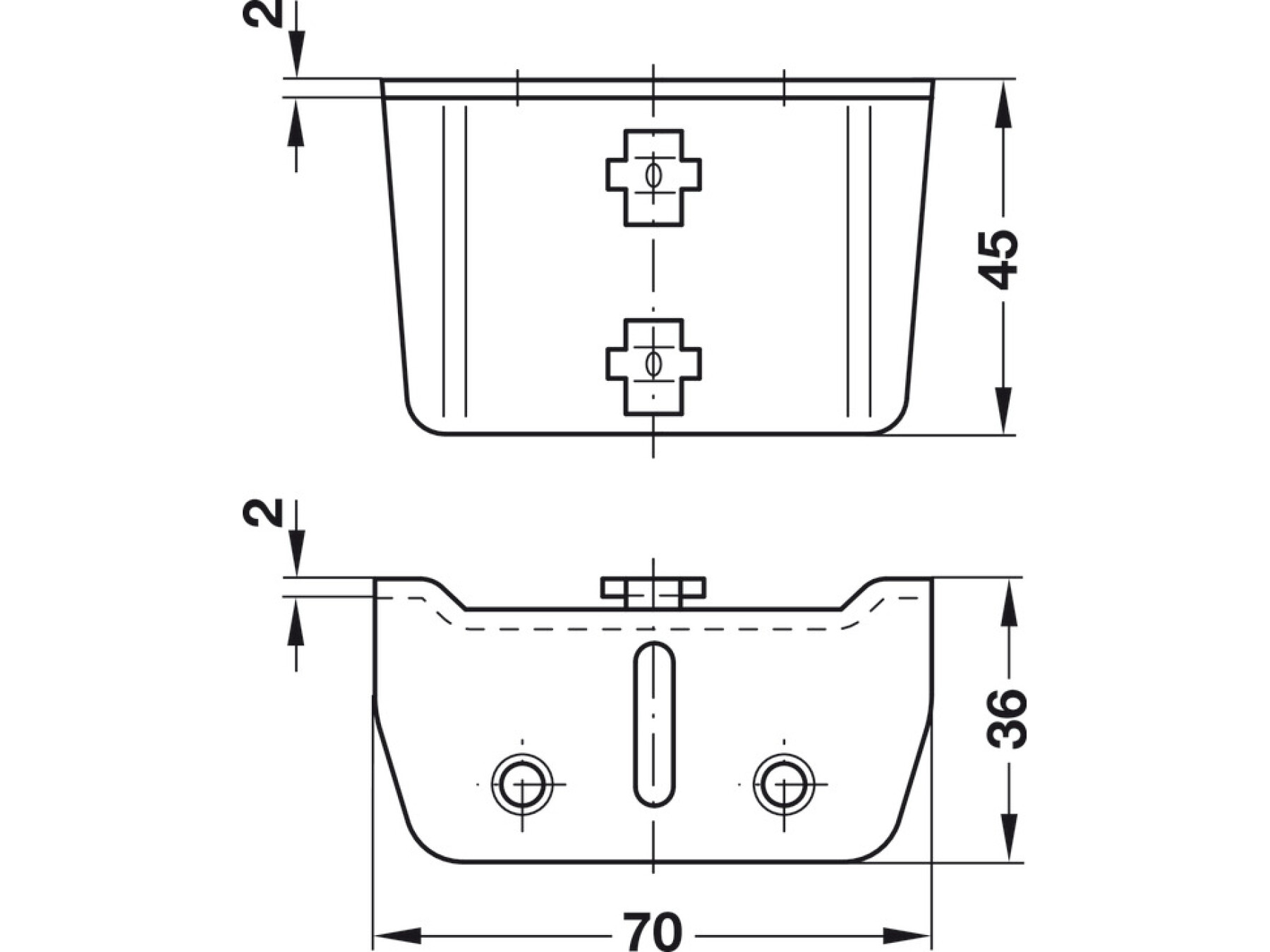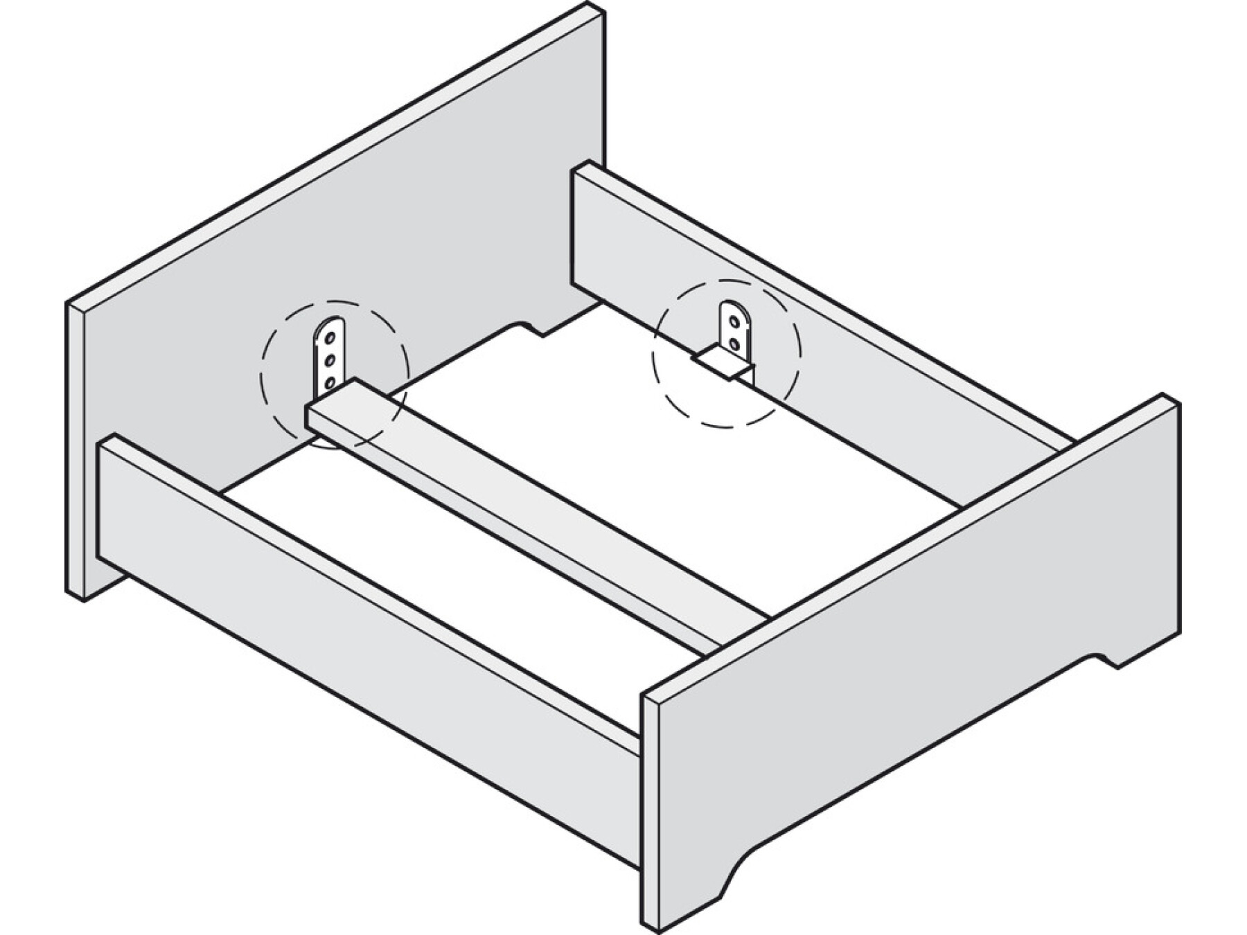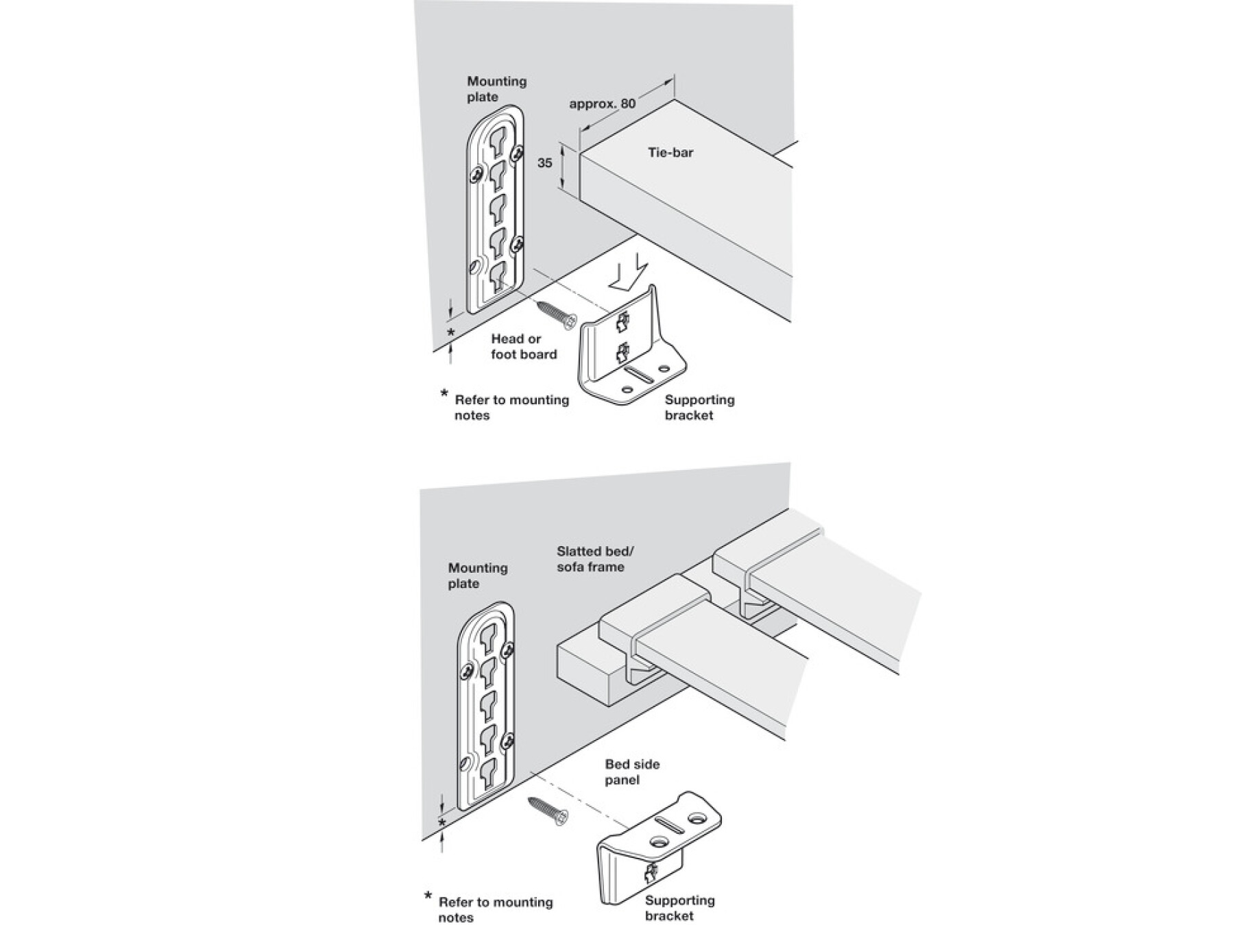 When used on double beds with a 35 mm thick central tie-bar, the mounting plates must be screwed to the headboard and the foot section 5 mm higher in comparison to the side panels so that the supporting surfaces of the bracket and the central tie-bar are on one level.