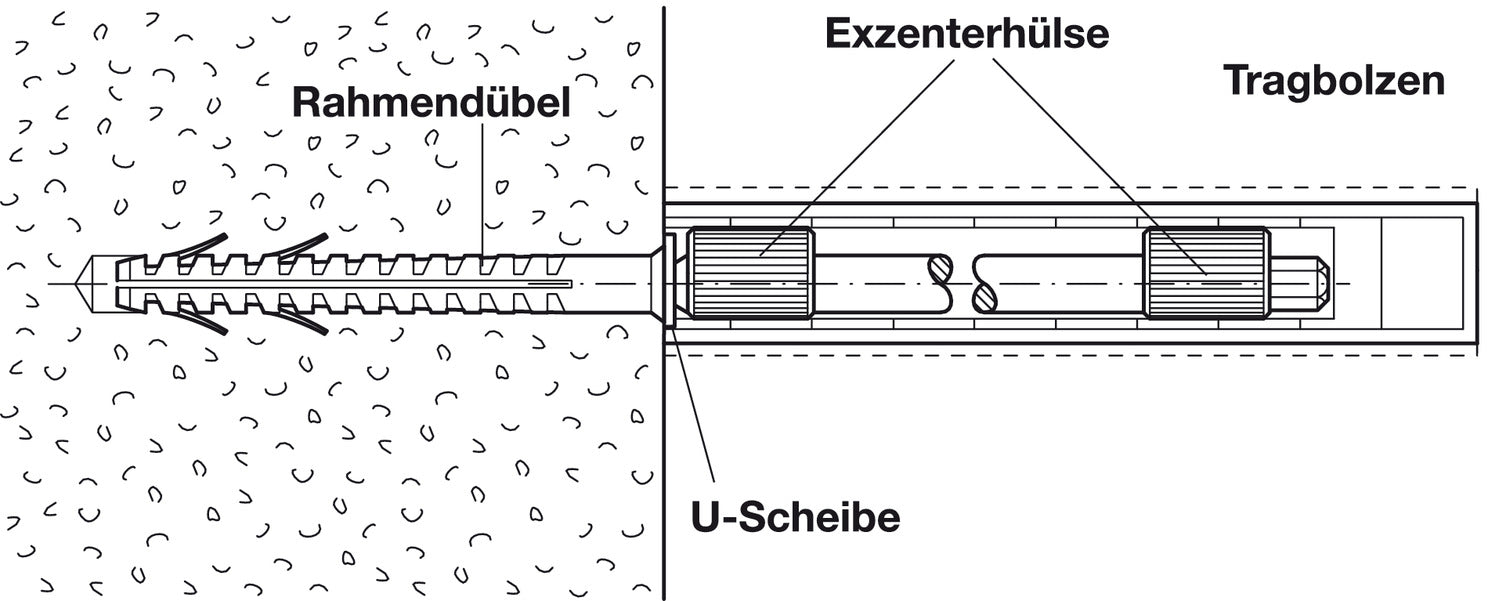 - Material: Threaded screw and washer: steel. Eccentric sleeves and wall plug: Polyamide