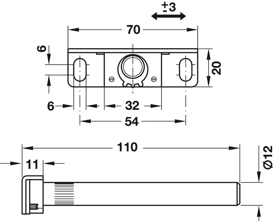 Supporting pin with knurled section is installed in a ‚Ø 12 mm hole in the shelf, the pin may be exposed or concealed depending on the thickness of the shelf. Height adjustable via slots. Inclination adjustment using adjusting screws which press on the rear plate when turned in. Lateral adjustment by lifting the supporting pin; can be adjusted to the right or left