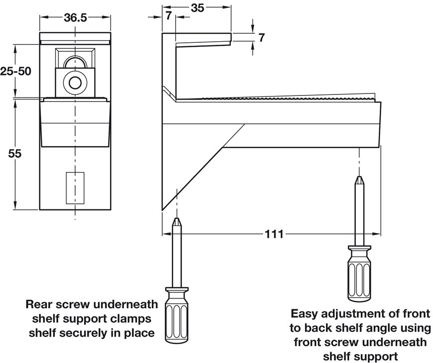 - Load bearing capacity: 25 kg for a shelf 320 mm deep