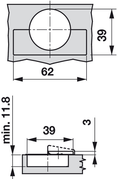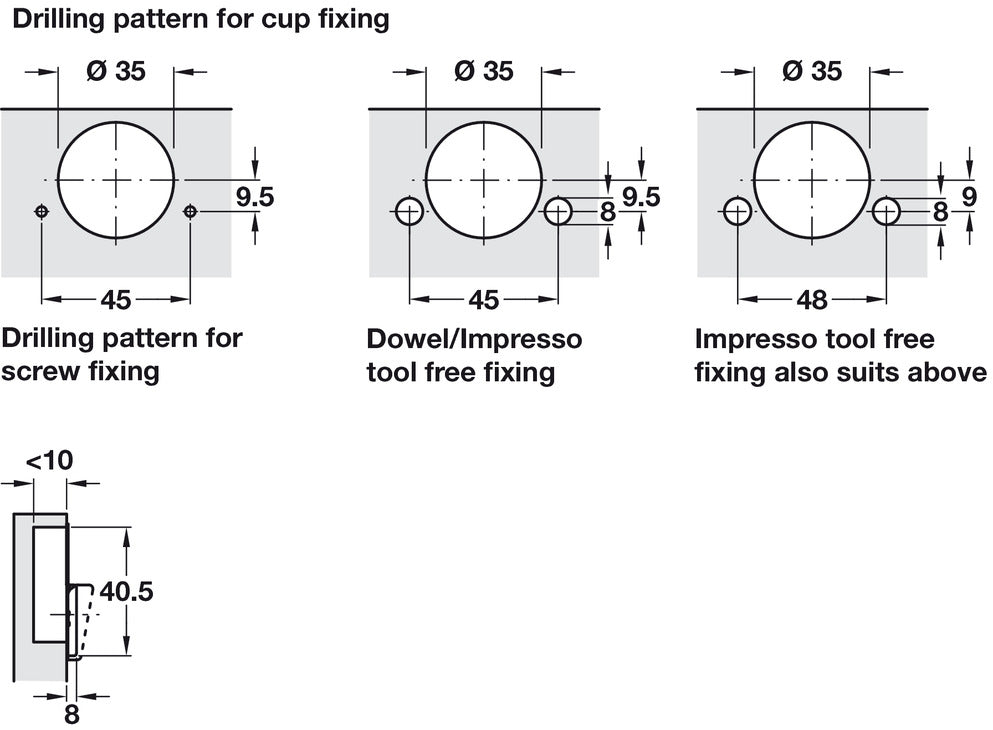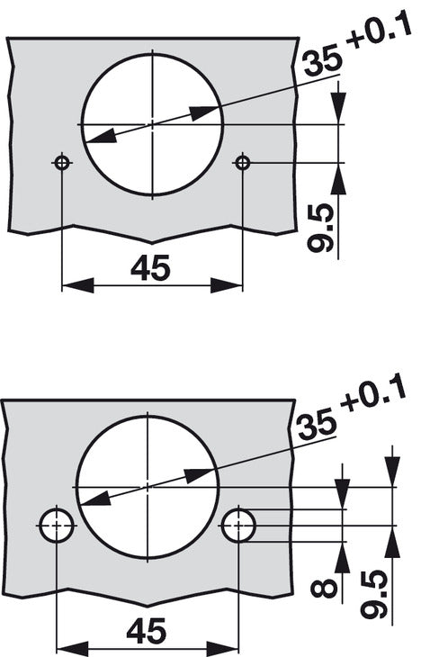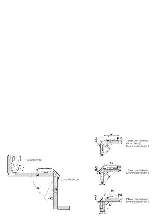 - For door thickness: Up to 24 mm (factory setting is for 19 mm door thickness for 3.5 mm cup distance)
