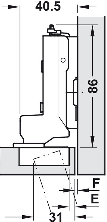 • Minimum gap for doors with chamfered edges (r = 1 mm) with factory settingsDoor thickness mmDistance to cup E¬¨¬®‚Äö√тĆmm3.04.05.06.07.0160.60.60.60.60.6170.60.60.60.60.6180.70.70.70.70.7190.90.90.90.90.9201.11.11.11.11.1211.41.31.31.31.3221.61.61.61.51.5242.42.12.12.12.0Minimum gap F