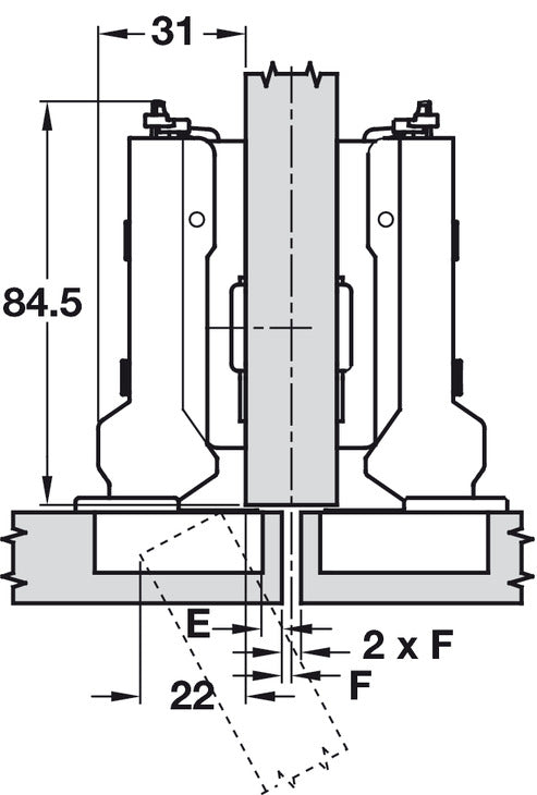- Minimum gap for doors with chamfered edges (r = 1 mm) with factory settingsDoor thickness mmDistance to cup E mm3.04.05.06.07.0160.60.60.60.60.6170.60.60.60.60.6180.70.70.70.70.7190.90.90.90.90.9201.11.11.11.11.1211.41.31.31.31.3223.02.01.51.51.5246.45.44.43.42.4Minimum gap F
