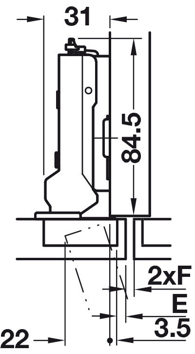 - Minimum gap for doors with chamfered edges (r = 1 mm) with factory settingsDoor thickness mmDistance to cup E mm3.04.05.06.07.0160.60.60.60.60.6170.60.60.60.60.6180.70.70.70.70.7190.90.90.90.90.9201.11.11.11.11.1211.41.31.31.31.3223.02.01.51.51.5246.45.44.43.42.4Minimum gap F
