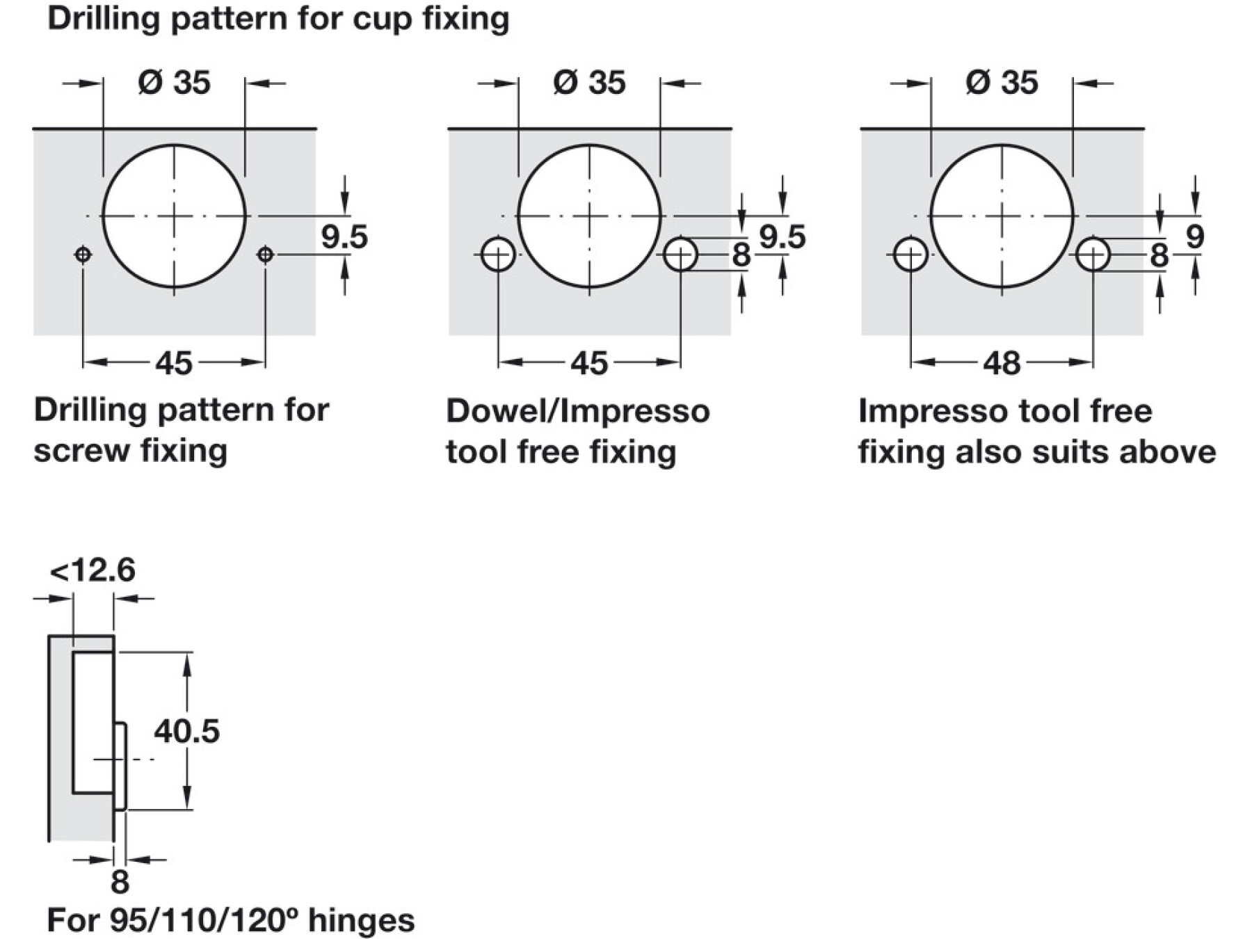 For standard applicationsØ 35 mm cupAdjustment facility Side adjustment 2 mm, Height adjustment -2.5 – 2.5... Read More