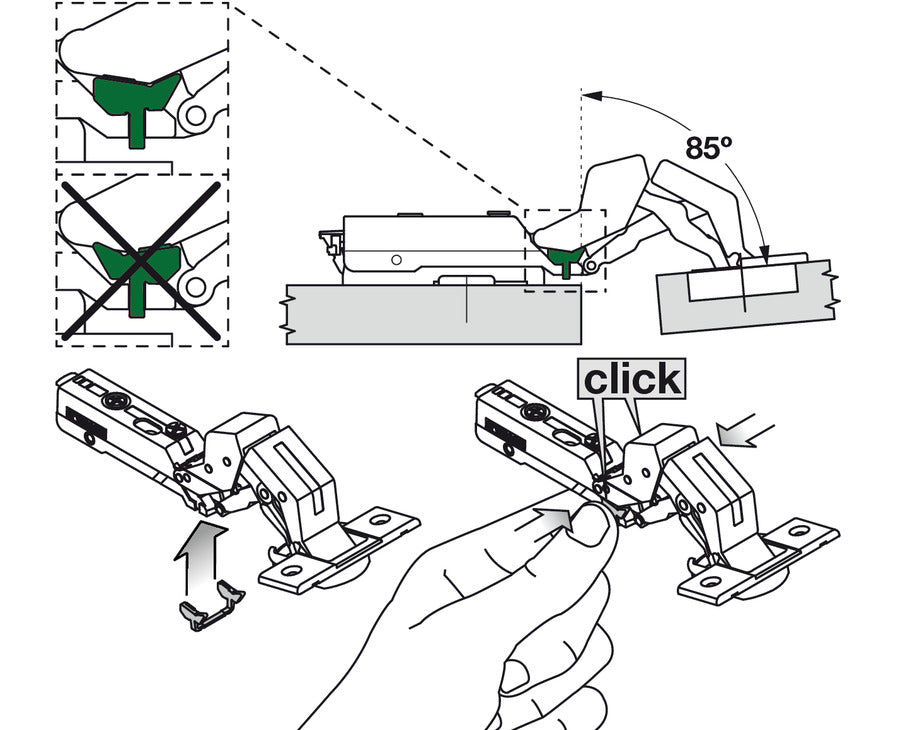 Prevents the door from butting against front panels or walls with corner mounting by reducing opening angle to 90°