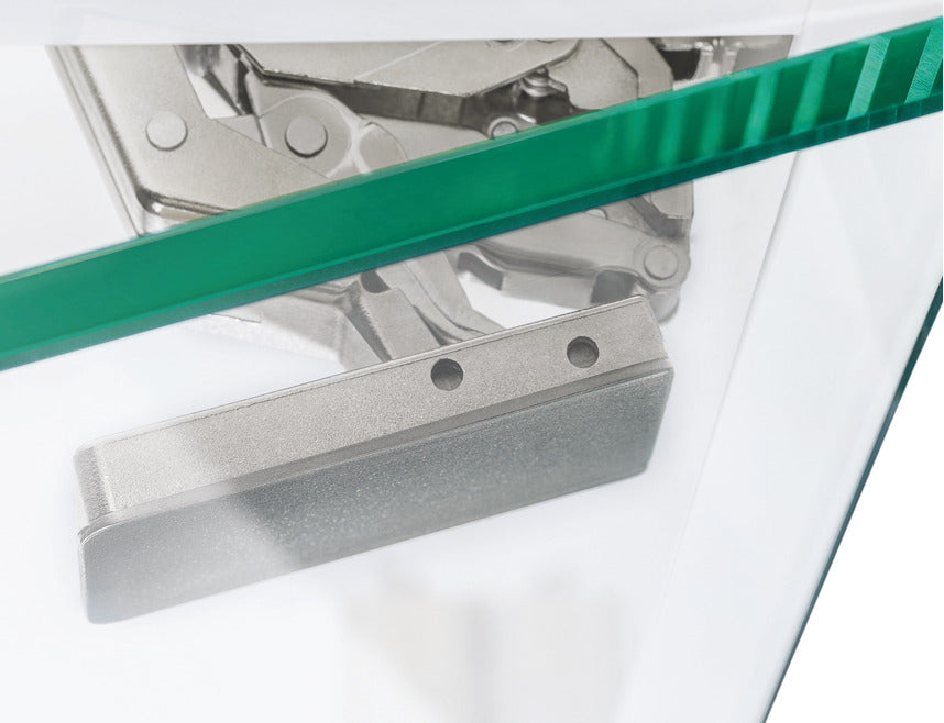 - Installation: Fastening to door by gluing of a zinc alloy adapterof the door to the hinge by sliding onto the adapter and using a camdoor to cabinet without tools (clip system)