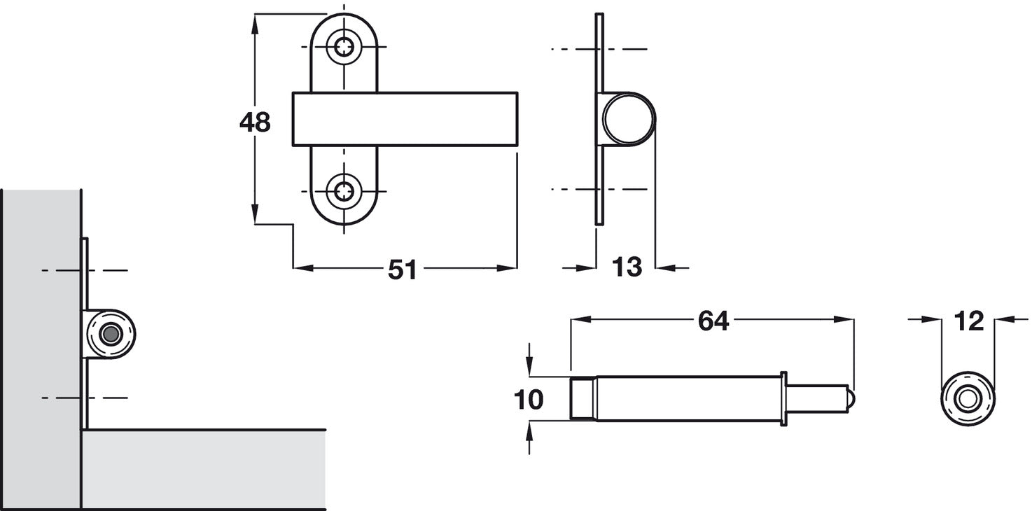 - Installation: Must be fitted 10-15 mm from hinge side in the cabinet