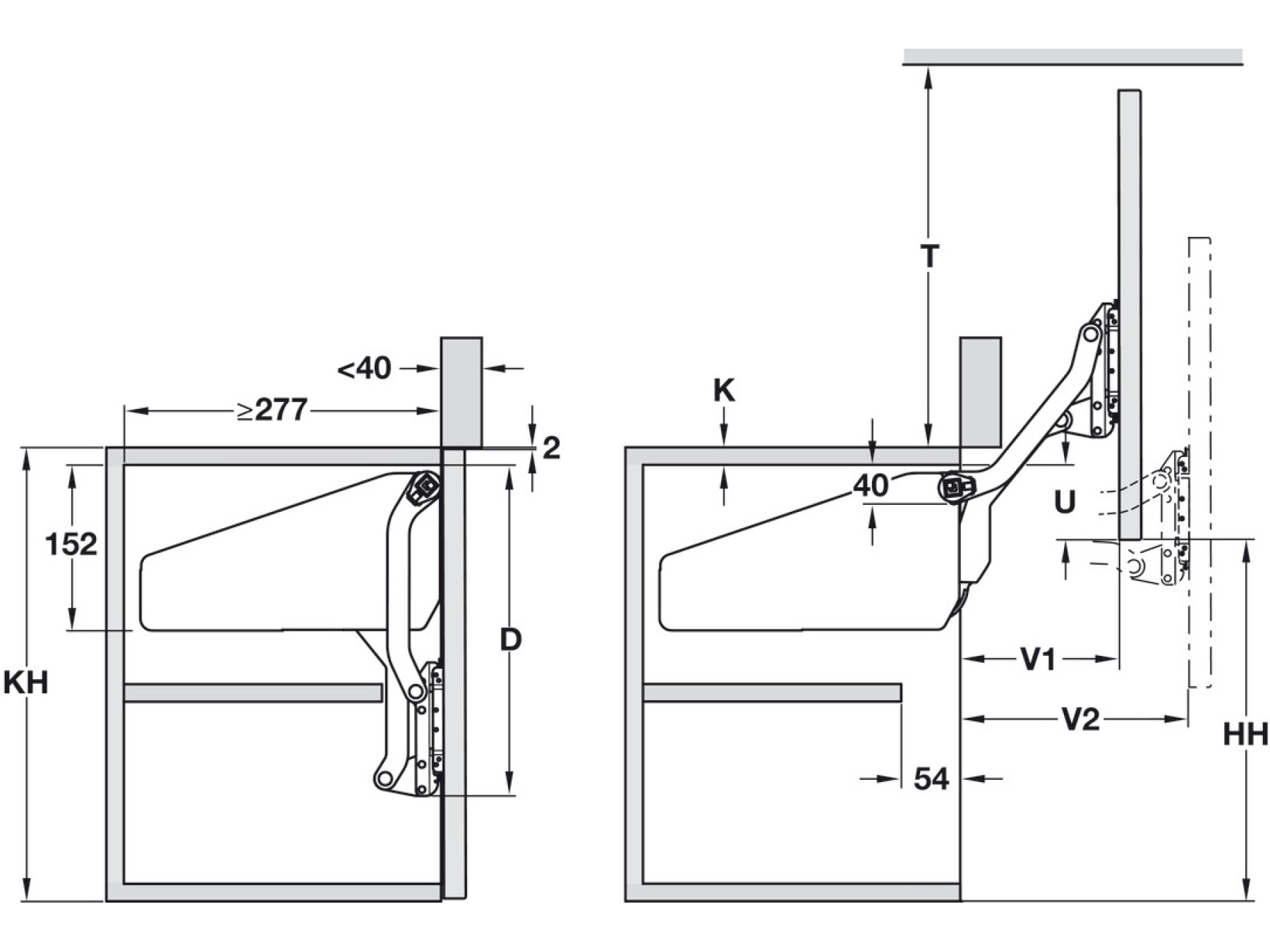 Hardly any space required in the room towards the front. Can be used in combination with upper-mounted cabinets or front panels. Creates practical storage compartments in tall cabinets. Cabinet contents are extremely easy to access