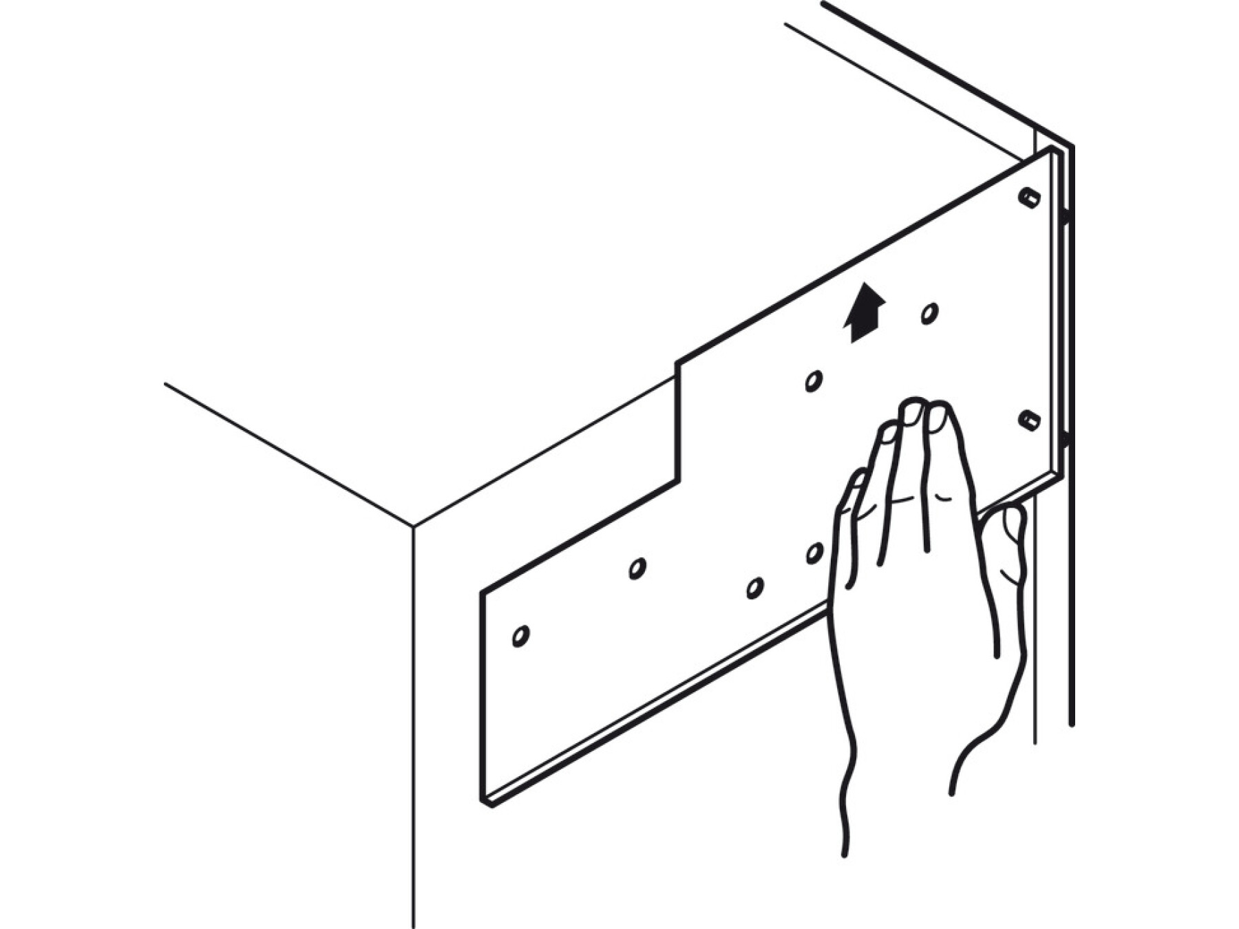 Drilling pattern, see installation instructions of the fitting. The drilling jig is positioned in the top left or top right cabinet corner.