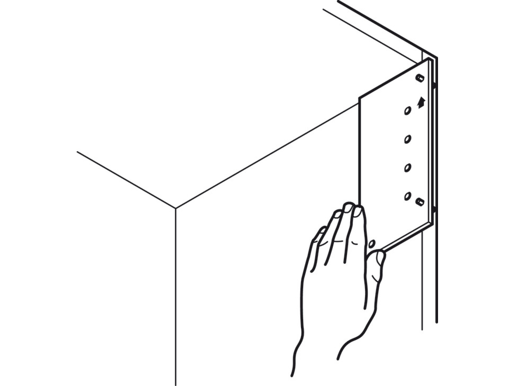 Drilling pattern, see installation instructions of the fitting. The drilling jig is positioned directly in the top left or top right cabinet corner.