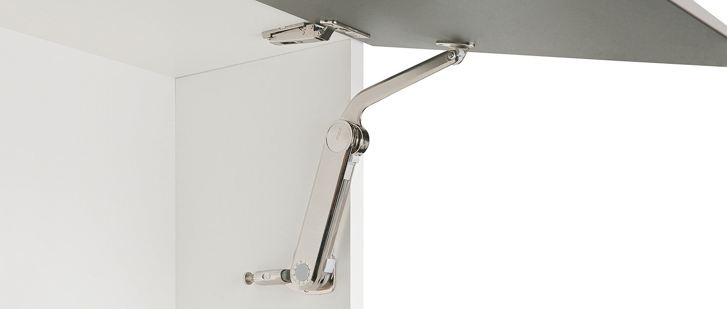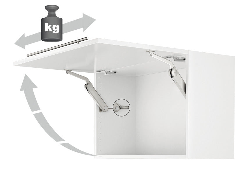 - : Maxi. For flaps made from wood or with aluminium frame MAXImal-Talent: Many different applications can be achieved by varying the mounting point of just a single fitting, e.g. front panels without handles or effortless opening of even large and heavy flaps up to 50 kg (depending on flap height and mounting situation)Multi position stop function: The fitting can be adjusted so that it reliably holds the flap in any position. Separate soft closing mechanism available as accessory. Can also be used in combination with Duomatic Push self-opening concealed hinges or concealed hinges with integrated soft closing mechanism (trial mounting required)Standard application. For one-piece flaps made from wood or with aluminium frame, with handle. Flap weight up to 54.6 kg (depending on flap height and mounting situation)Holds the flap reliably in any position. With power assisted opening. Edge distance 28/37 mm. Mounting option for reducing amount of force required to open flap. For one-piece flaps made from wood or with aluminium frame, with handle. Functionality: Mounting 63 mm from the edge and rotating the cabinet mounting bracket by 180deg (bracket to the front) reduces the force required for opening flaps with certain flap heights and weights. Holds the flap reliably in any position. Trial mounting required Maxi edge distance 63 mm (mounting bracket turned by 180deg. Touch Opening mounting version for front panels without handles. For handle-free, one-piece flaps made from wood or with aluminium frame. Functionality: A gentle push opens the flap slightly, it can then be fully opened and closed again by hand. Magnet function: Held closed by magnetic door catch and counterplate on the flap. Holds the flap reliably in any position. Edge distance 63 mm. Adjustment facility. Height adjustment*Side adjustment*Tilting angle adjustment*Holding power adjustment with SW10 hexagon socket key* depending on the hinges that are used. Holding power adjustment with SW10 hex key. Note: Use numbers 1- 8 for adjusting the holding power. Use numbers 9-12 to re-adjust flap after a certain time (if necessary).Note: Space requirement of installed fitting approx. 26 mm inside the cabinet.