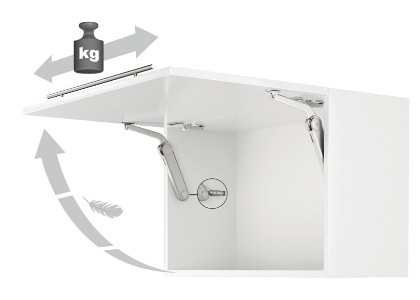 - : Maxi For flaps made from wood or with aluminium frame MAXImal-Talent: Many different applications can be achieved by varying the mounting point of just a single fitting, e.g. front panels without handles or effortless opening of even large and heavy flaps up to 50 kg (depending on flap height and mounting situation)Multi position stop function: The fitting can be adjusted so that it reliably holds the flap in any position. Separate soft closing mechanism available as accessory. Can also be used in combination with Duomatic Push self-opening concealed hinges or concealed hinges with integrated soft closing mechanism (trial mounting required)Standard application. For one-piece flaps made from wood or with aluminium frame, with handle. Flap weight up to 54.6 kg (depending on flap height and mounting situation)Holds the flap reliably in any position. With power assisted opening. Edge distance 28/37 mm. Mounting option for reducing amount of force required to open flap. For one-piece flaps made from wood or with aluminium frame, with handle. Functionality: Mounting 63 mm from the edge and rotating the cabinet mounting bracket by 180deg (bracket to the front) reduces the force required for opening flaps with certain flap heights and weights. Holds the flap reliably in any position. Trial mounting required. Maxi edge distance 63 mm (mounting bracket turned by 180degTouch Opening mounting version for front panels without handles. For handle-free, one-piece flaps made from wood or with aluminium frame. Functionality: A gentle push opens the flap slightly, it can then be fully opened and closed again by hand. Magnet function: Held closed by magnetic door catch and counter plate on the flap. Holds the flap reliably in any position. Edge distance 63 mm. Adjustment facility. Height adjustment*Side adjustment*Tilting angle adjustment*Holding power adjustment with SW10 hexagon socket key* depending on the hinges that are used Holding power adjustment with SW10 hex key. Note Use numbers 8 for adjusting the holding power. Use numbers 9-12 to re-adjust flap after a certain time (if necessary).Note. Space requirement of installed fitting approx. 26 mm inside the cabinet.
