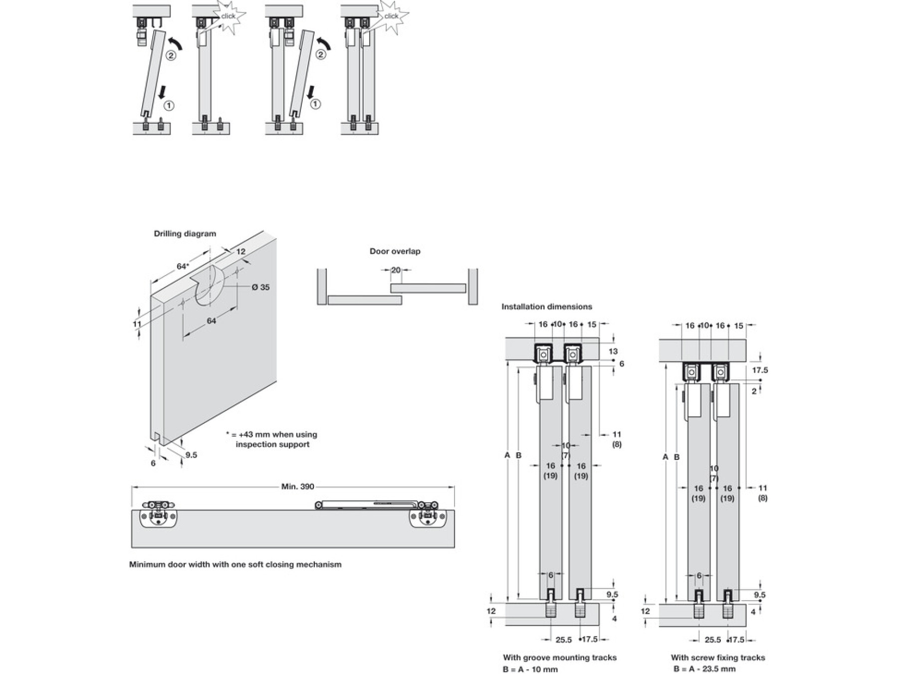 Pitch length of running gears must be min. 245 mm with soft closing mechanism on one side and min. 425 mm with soft closing mechanism on both sides.