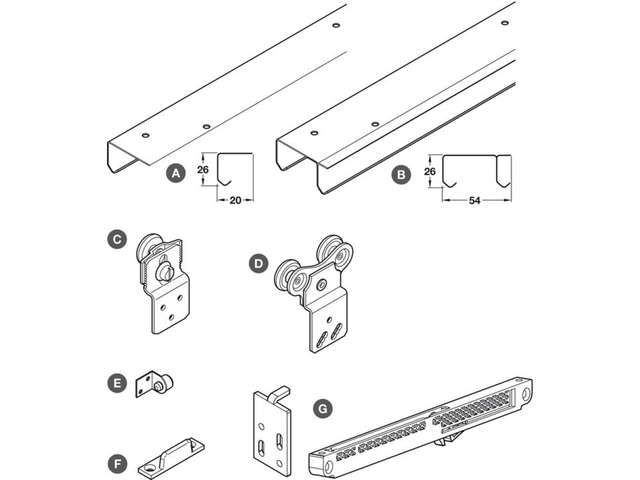 Set for 2 doors consists of 1 x Double Top track, length 2000 mm, pre-drilled for screw mounting, silver anodised aluminium, 4 x Running Gear, screw fixing, grey finish steel with nylon roller, 2 x Door Buffers, aluminium with black rubber buffer, 4 x Bottom guides, screw fixing, plastic, 4 x Soft brake set, for mounting top track, load capacity min. 15 kg max. 50 kg, grey finish steel nylon roller