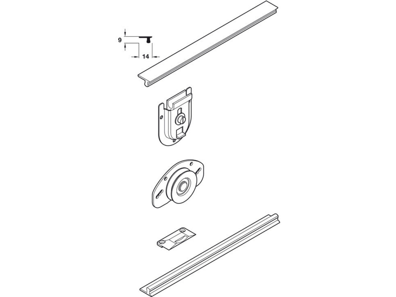 Set for 2 doors consists of 4 x Reversible top/bottom track, length 2000 mm, pre-drilled for screw mounting, silver anodised aluminium, 4 x Top guide, screw fixing, grey finish steel with nylon roller, 2 x Positioning brake, walnut plastic, 4 x Bottom roller, screw fixing, grey finish steel with nylon roller