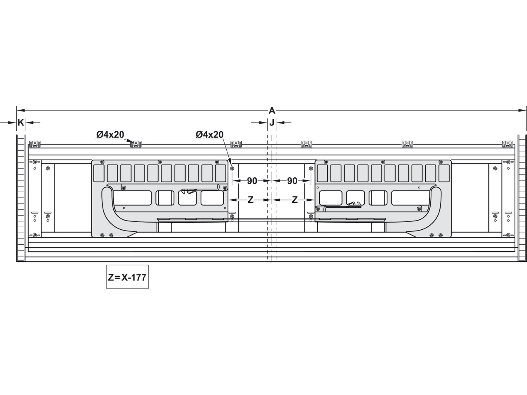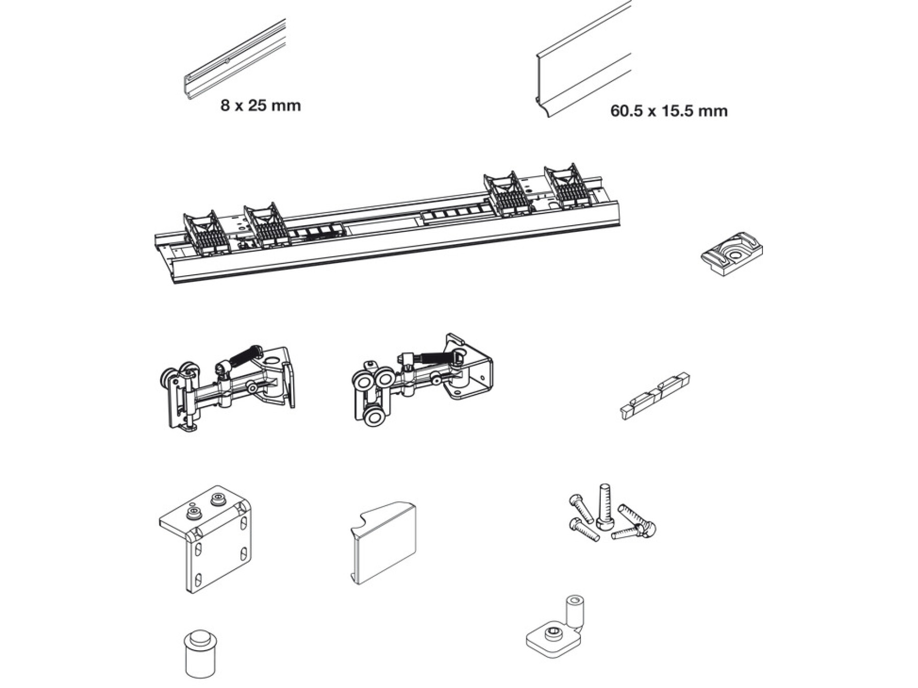 Complete set for 2 doors includes 1 x Guide track, screw fixing,aluminium, 2 x Fascia front fixation, anodised aluminium, 1 x Pre-mounted running gear with track, 14 x Mounting clips, plastic, 1 pair x Guide, left and right, 6 x Fascia clips, plastic, 4 x Front fixation, steel, 2 x Guide cover, plastic, 2 x Stopper to guide track, 8 x Buffer, plastic, Fixings and installation instructions