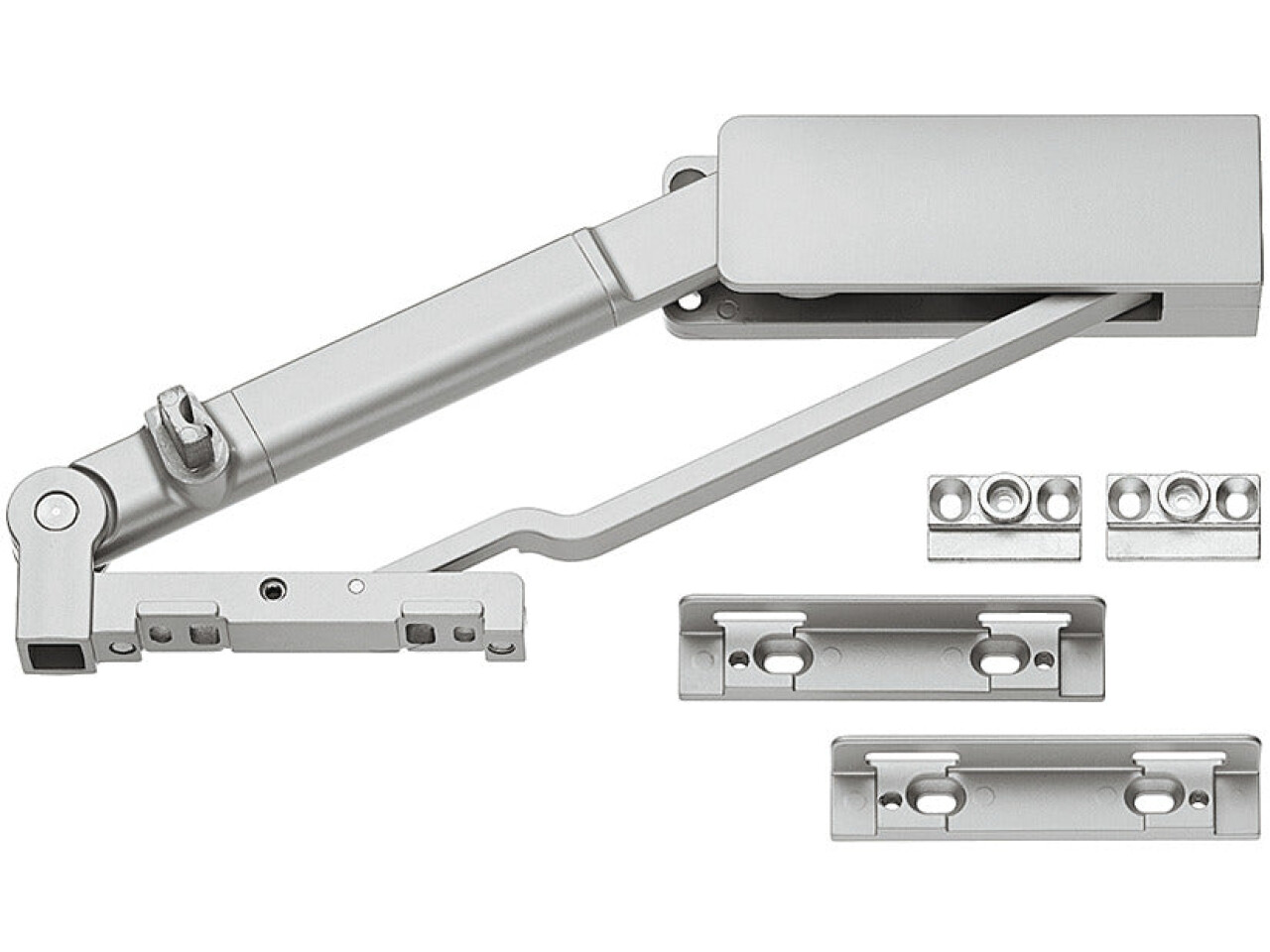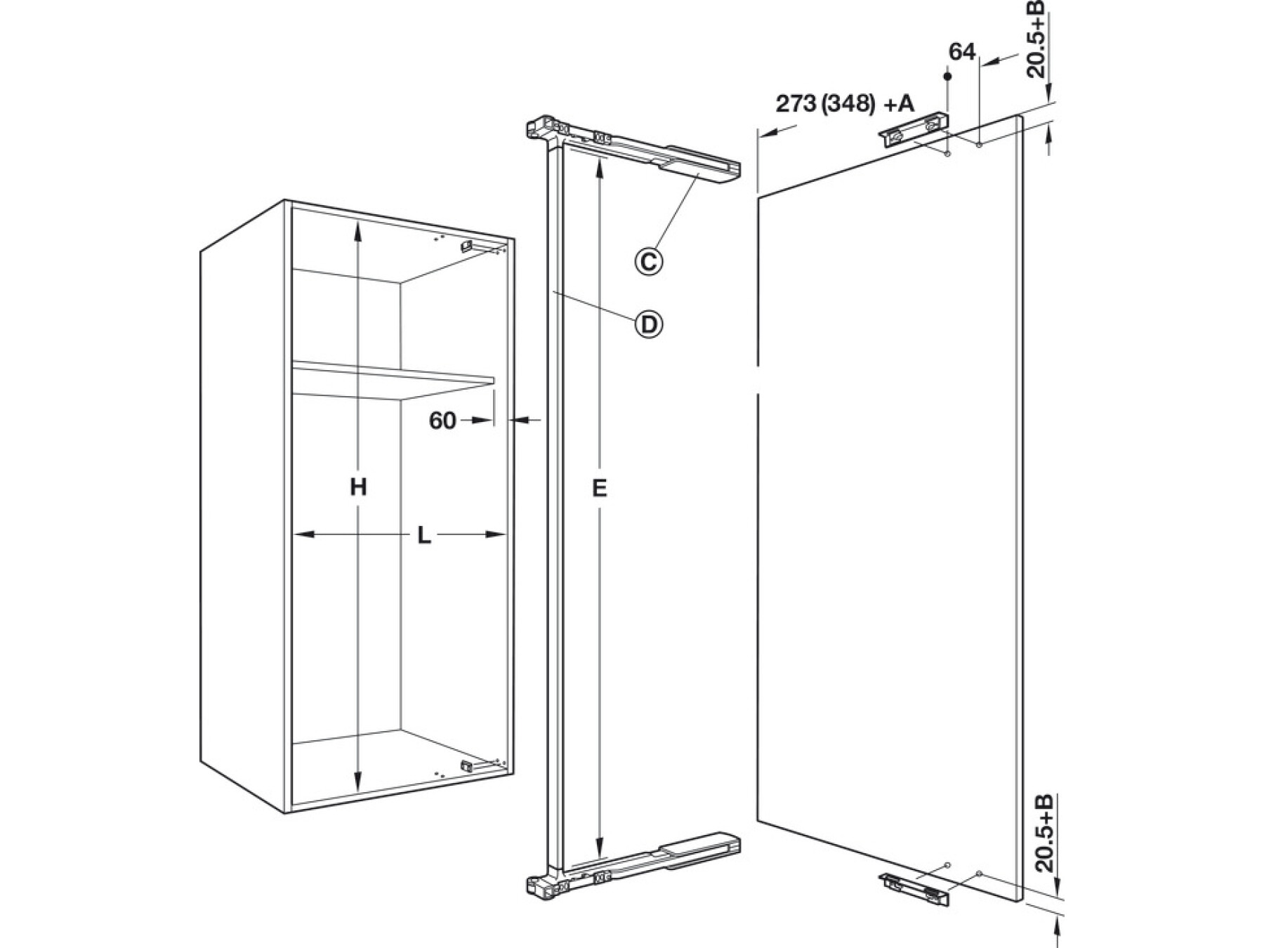 Set consists of 2 x handed fittings for fixing to cabinet ceiling and floor and 2 x door mounting brackets