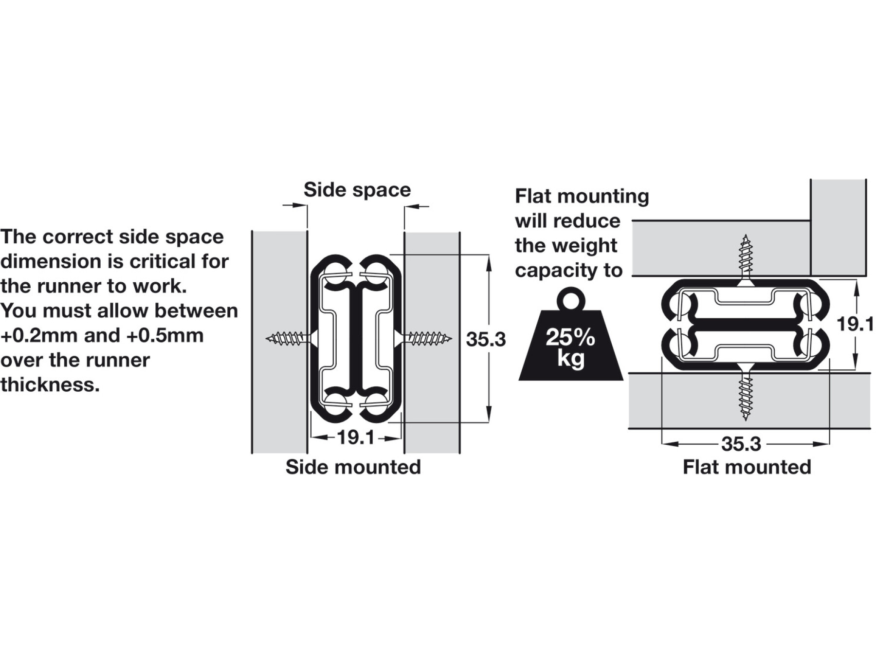 Weights limit per pair based on length, weight limits reduce by 75% if flat mounted