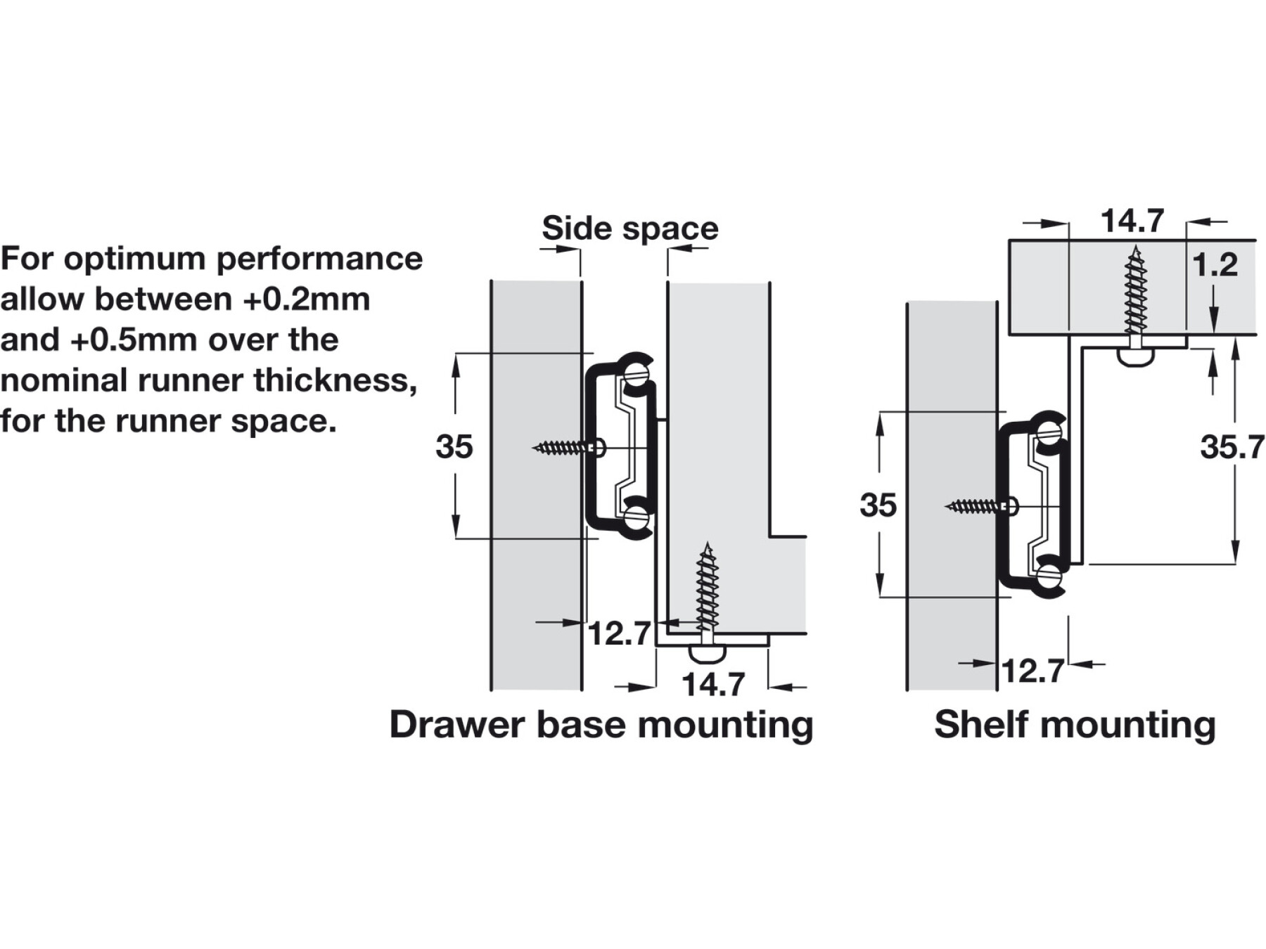 For bottom mounting of drawers or, when inverted, for platform mounting of shelves