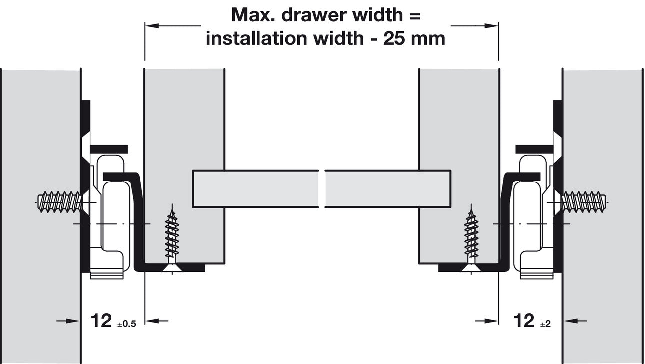 - Installation: Screw fixing to drawer and screw fixing using slots in carcase profile, 32 mm series drilled holes, base mounted