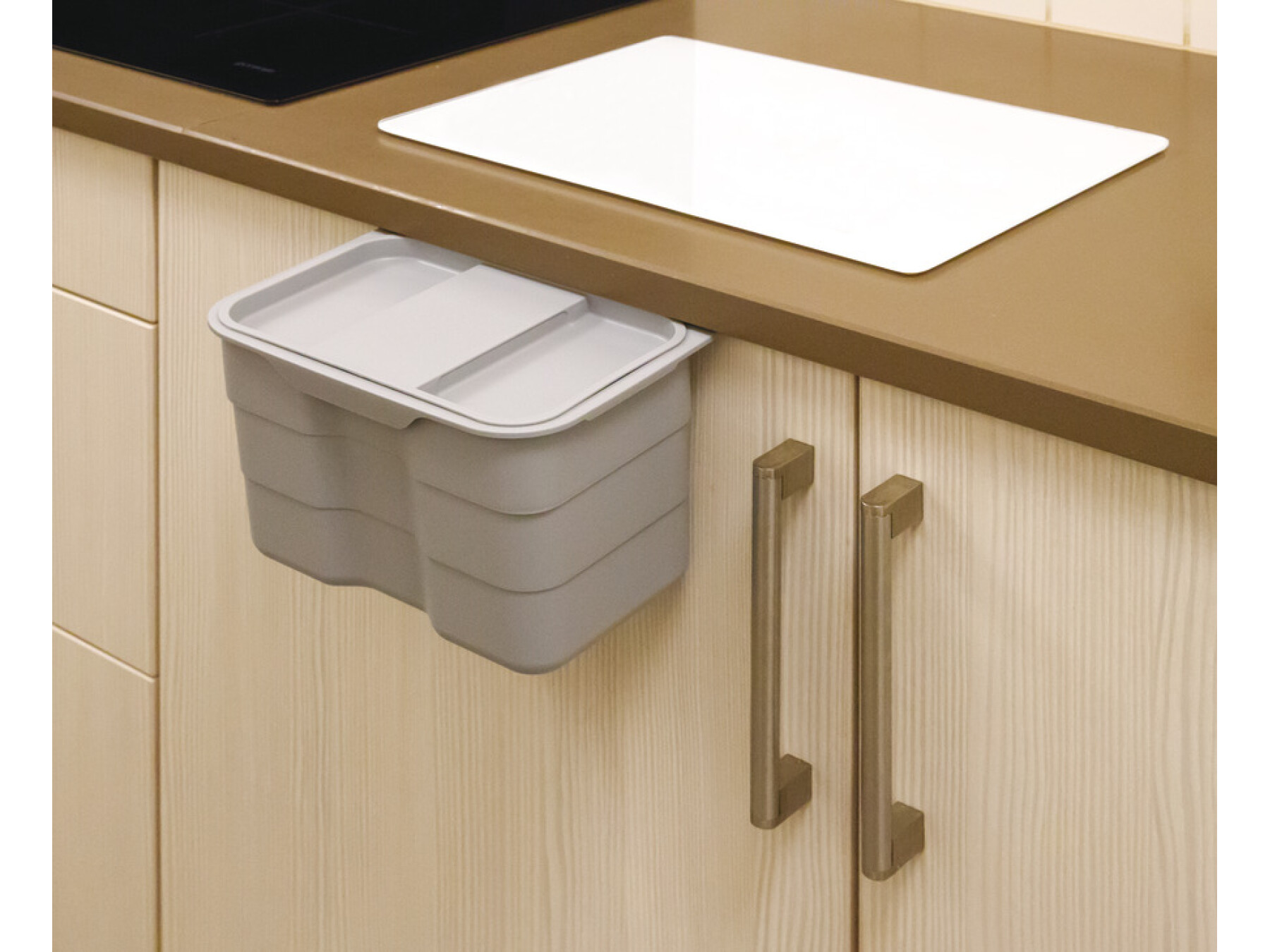 Hooks over the top of the cupboard door and fitting under the worktop