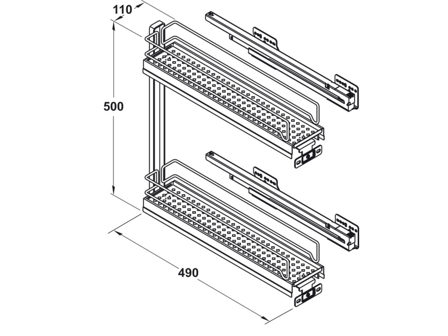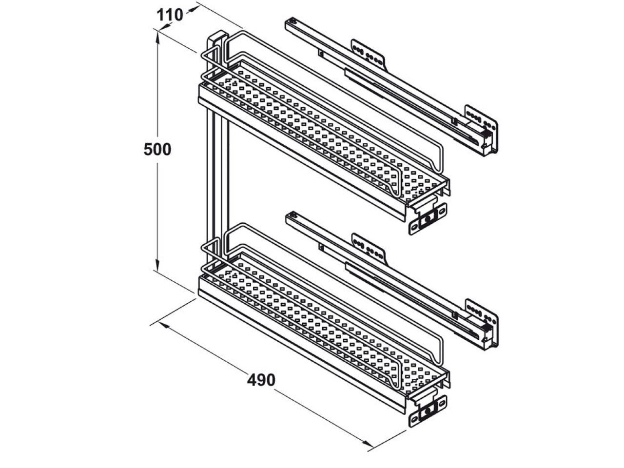 2x Storage baskets, heavier gauge chrome plated steel with solid base1x Pair of ball bearing runners runners, galvanised steel, full extension, self closing4x Basket securing clips, zinc-plated steel2x Door hanging plates, zinc-plated steel