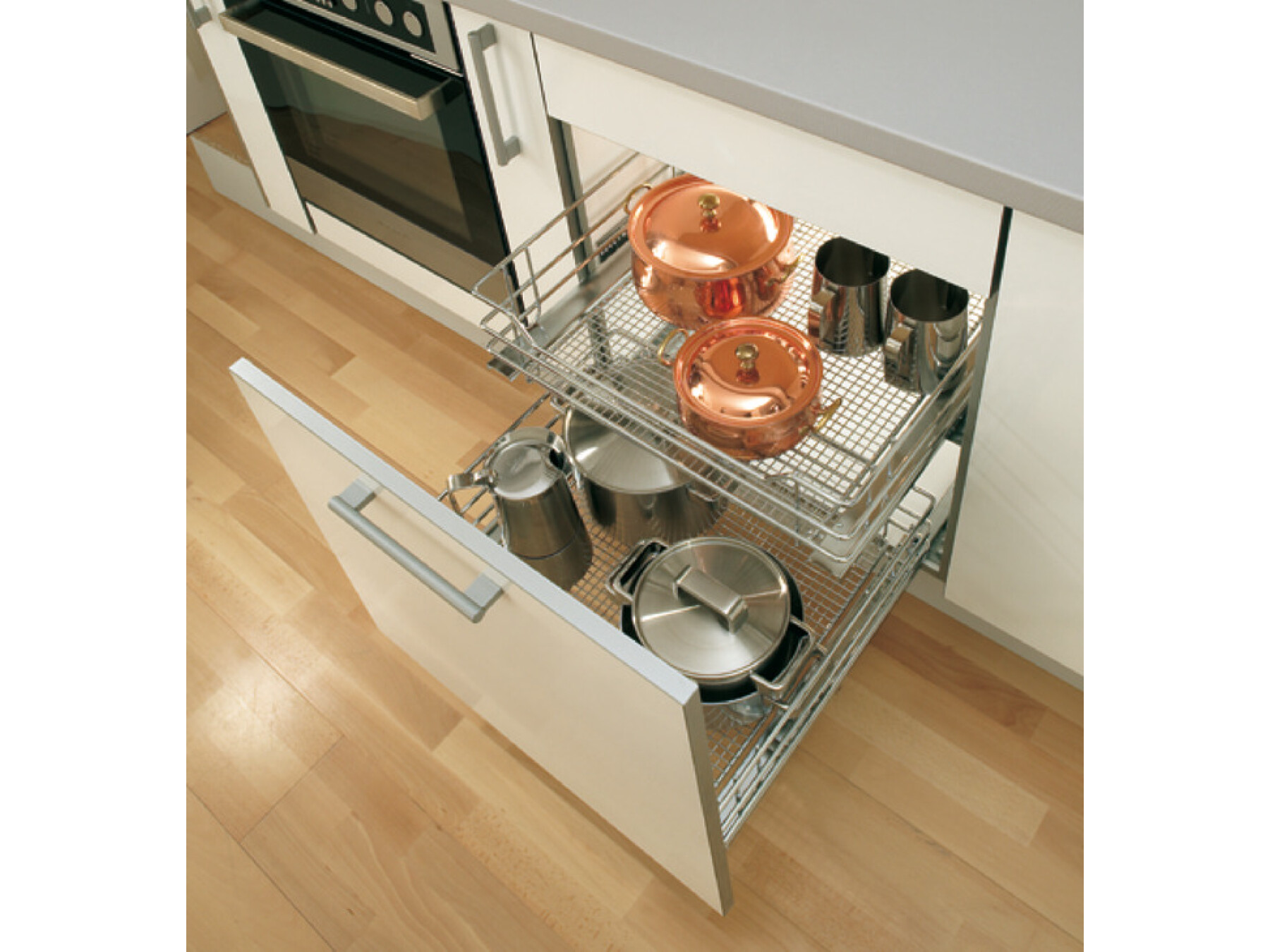 Area of application: For door front fixing cabinets. Supplied with: 1 storage basket, 1 pair ball bearing runners (full extension, self closing), and fitting instructions.