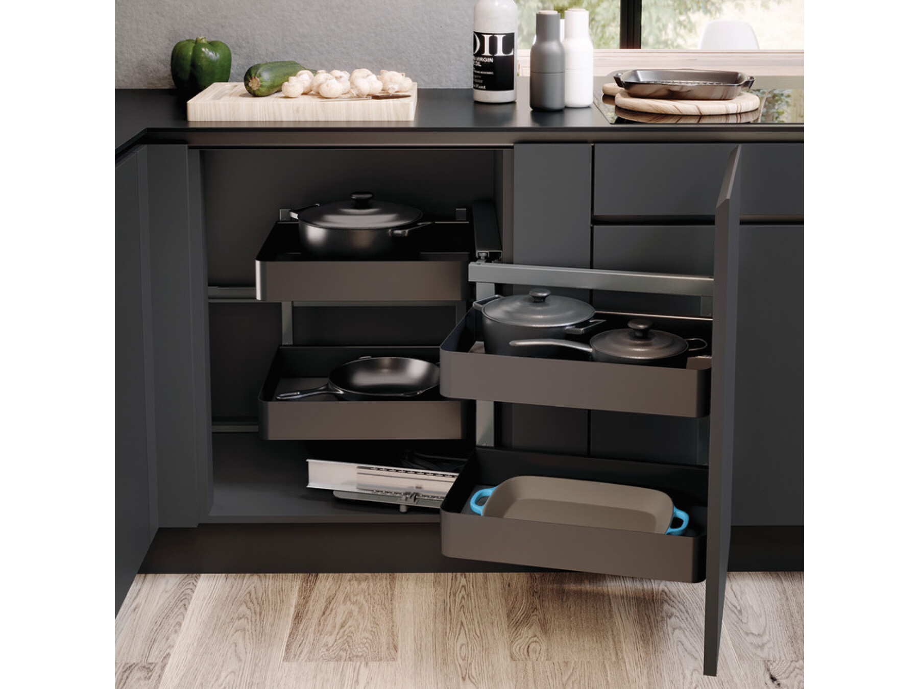 Upgrade your kitchen corner storage with the Swing Out Corner Storage, Planero Lava Grey Baskets, Vauth-Sagel VS COR Fold. for organised, accessible, and beautifully finished everyday storage.