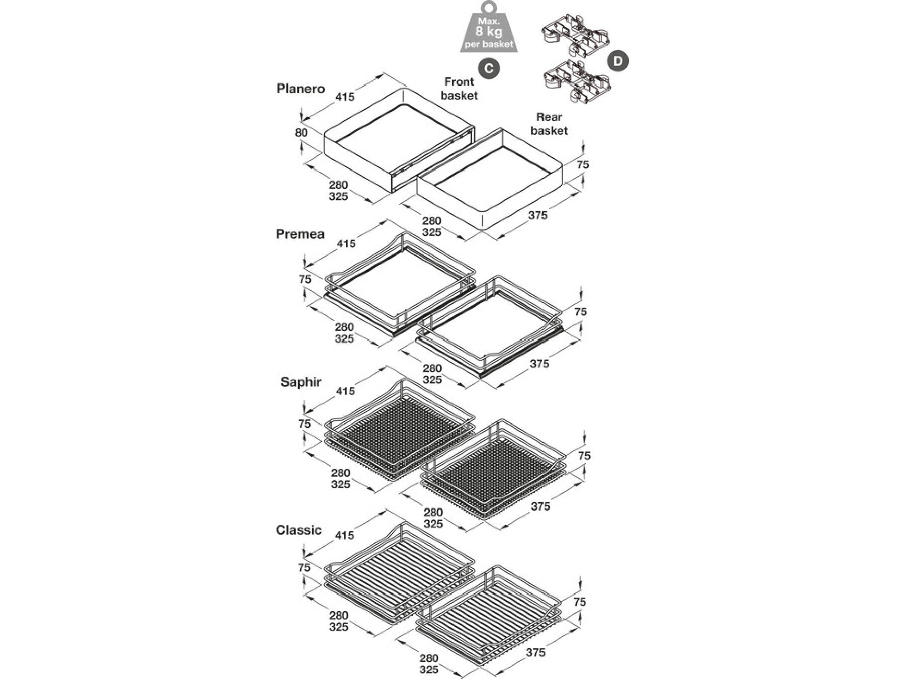 Choice of wire baskets: Classic linear silver, Classic linear chrome, Saphir chrome mesh, Premea solid base in white or grey or the newest planero lava grey finish