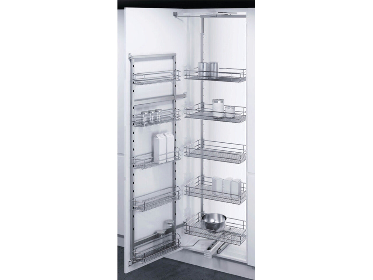 The pantry unit is easy to use; the baskets are pulled out of the cabinet at the same time as the door is opened