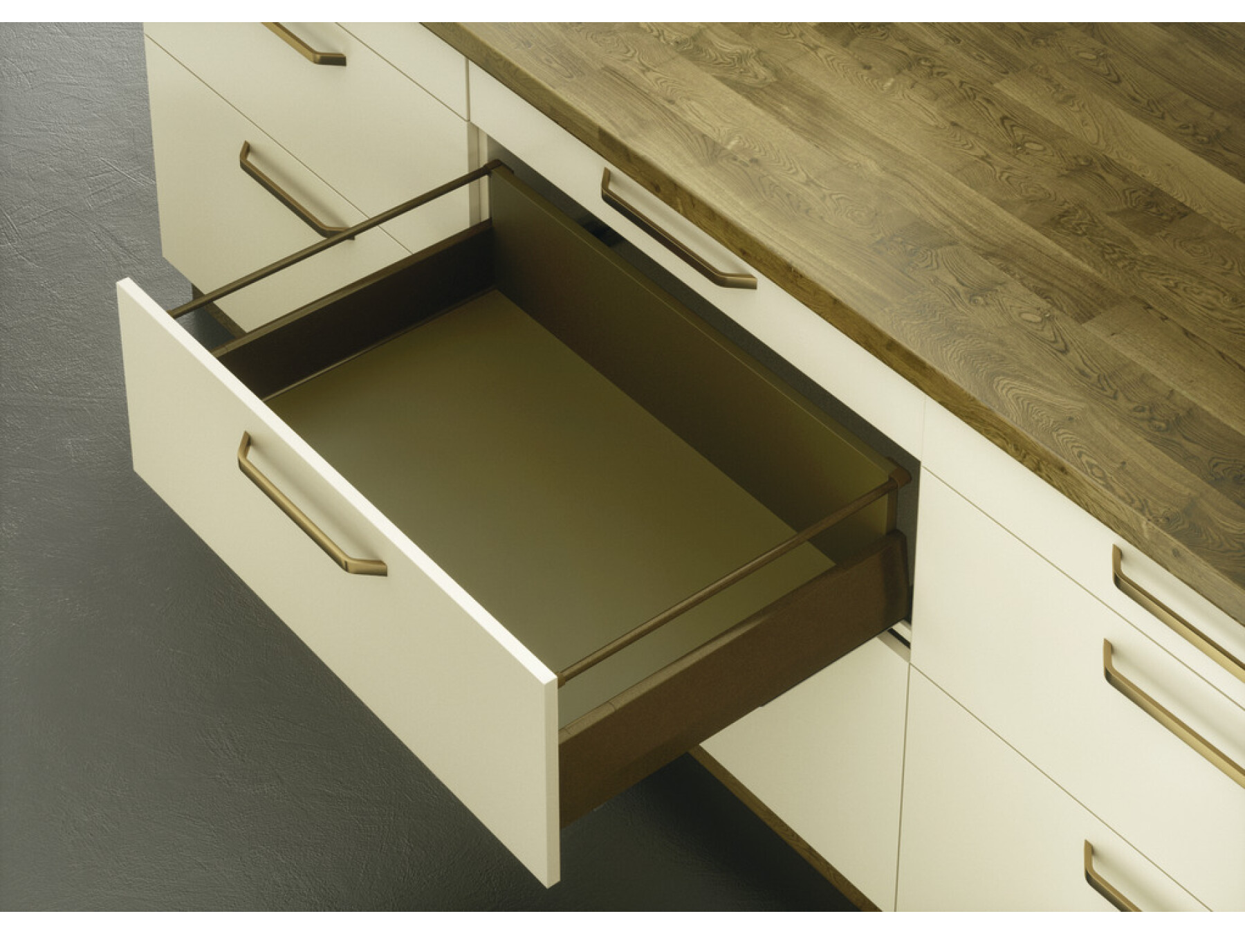 Colour of the railing matches the drawer sides