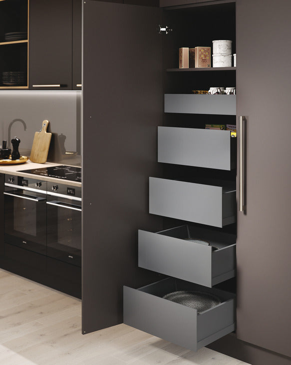 A flexible alternative to a larder unit, the Nova Pro Scala Stack Tower comes with pre-assembled drawers with solid 186 mm high sides, easy to install and allowing maximum capacity for storage. With integrated liquid Soft-close 40 kg weight capacity using fully synchronised runner technology without midway knock. Integrated height and side adjustment. Internal drawer front can be fitted and removed without tools. Optimal use of storage space due to straight inside narrow surfaces and narrow construction