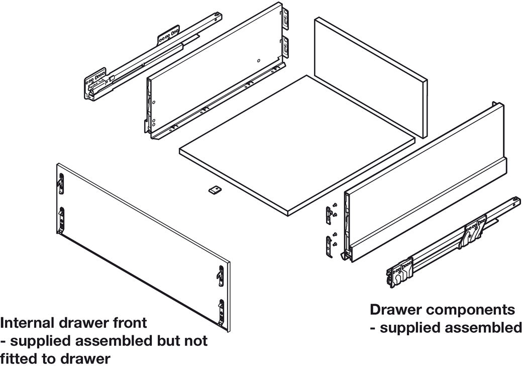 - Supplied with: Set consists of:1x Assembled standard drawer with 90 mm high drawer sides with internal standard drawer front (assembled, not pre-fitted)3 or 4x Assembled pan drawers 186 mm high drawer sides with internal drawer front (assembled, not pre-fitted)