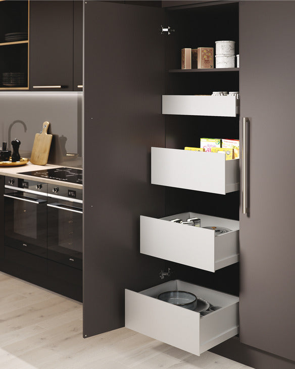 A flexible alternative to a larder unit, the Nova Pro Scala Stack Tower comes with pre-assembled drawers with solid 186 mm high sides, easy to install and allowing maximum capacity for storage. With integrated liquid Soft-close 40 kg weight capacity using fully synchronised runner technology without midway knock. Integrated height and side adjustment. Internal drawer front can be fitted and removed without tools. Optimal use of storage space due to straight inside narrow surfaces and narrow construction