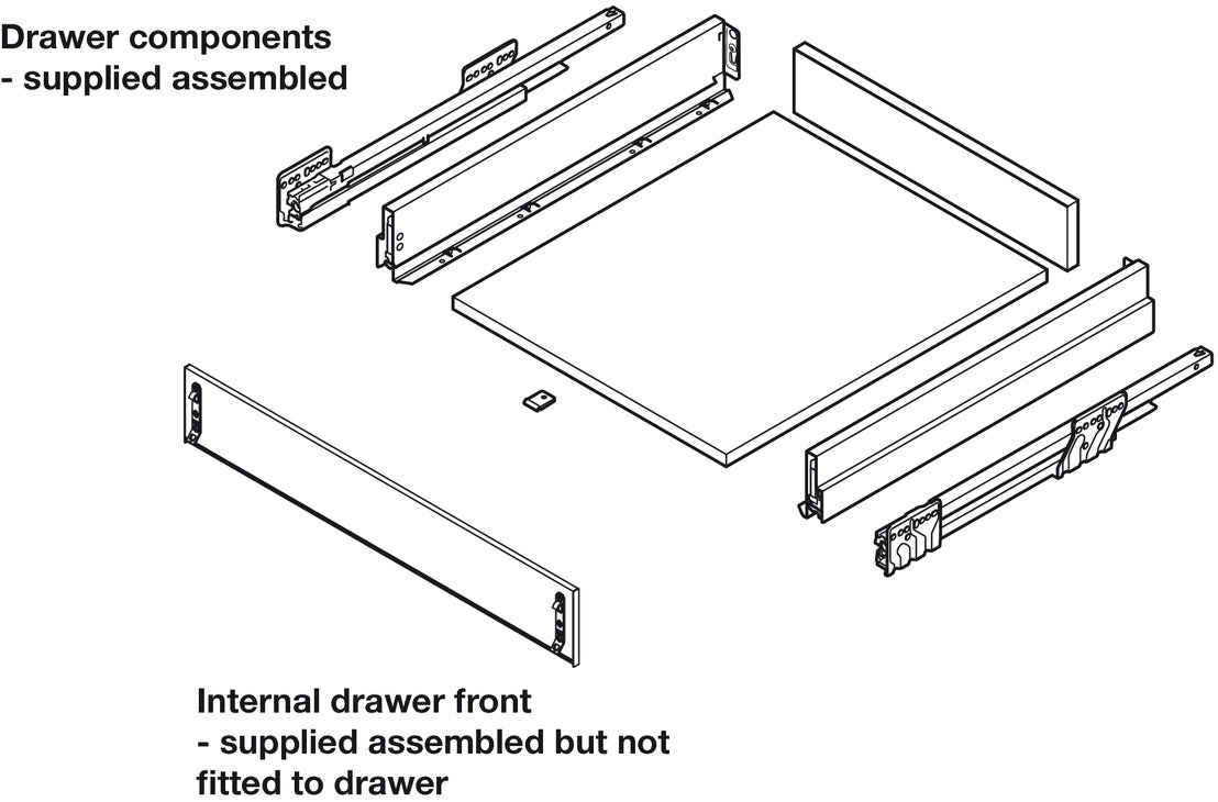 - Supplied with: Set consists of:1x Assembled standard drawer with 90 mm high drawer sides with internal standard drawer front (assembled, not pre-fitted)3 or 4x Assembled pan drawers 186 mm high drawer sides with internal drawer front (assembled, not pre-fitted)