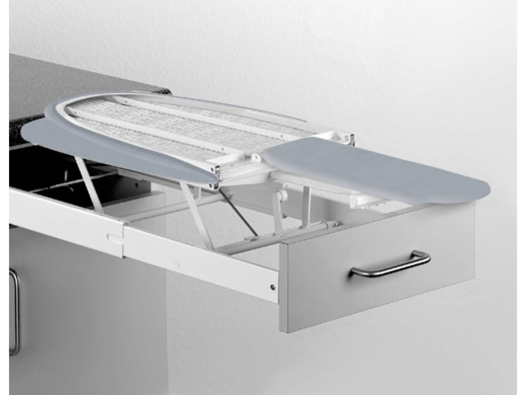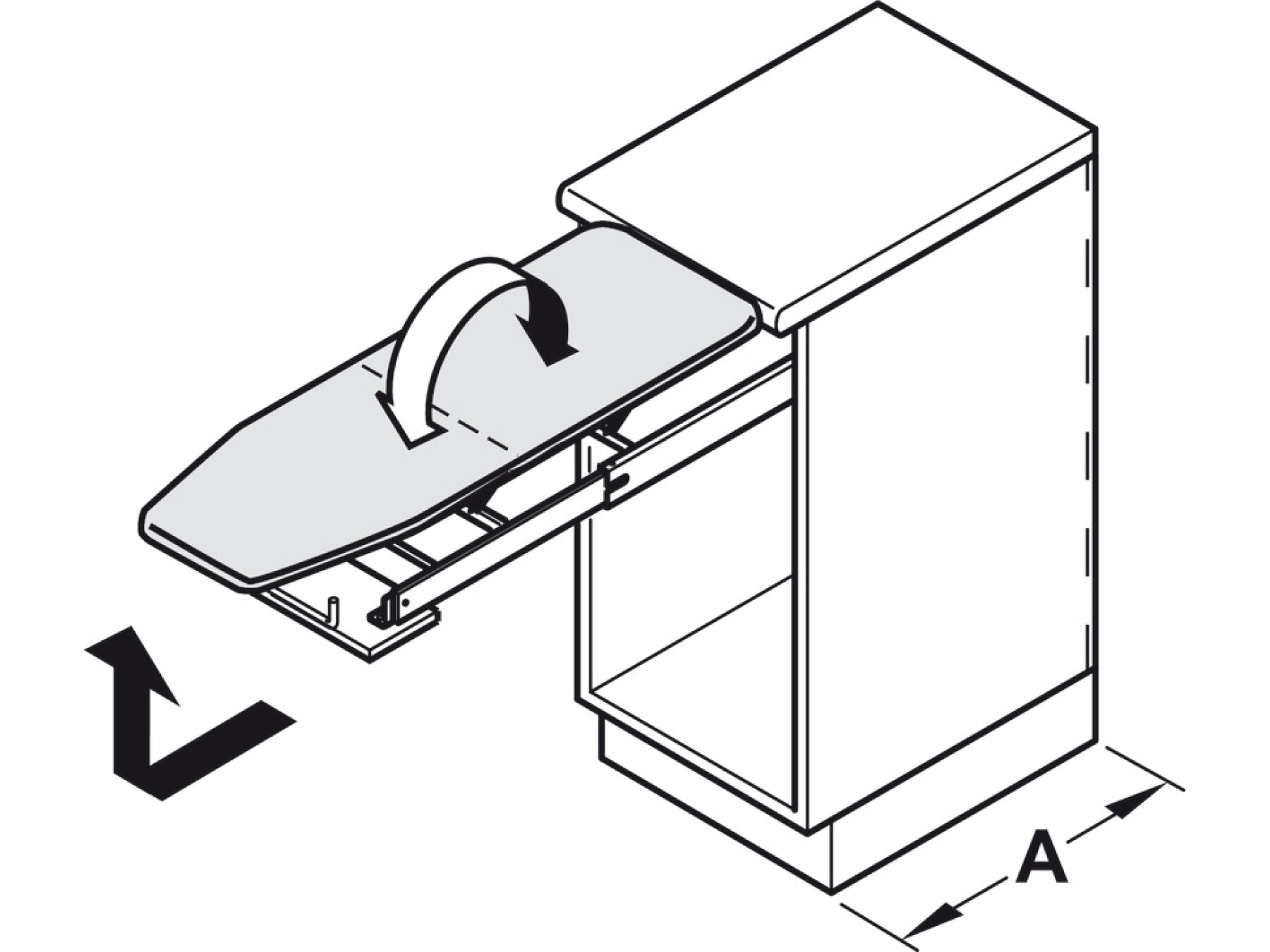 The entire ironing board is built into the drawer space of most standard base cabinets and can be accessed by simply pulling the drawer open and unfolding the board