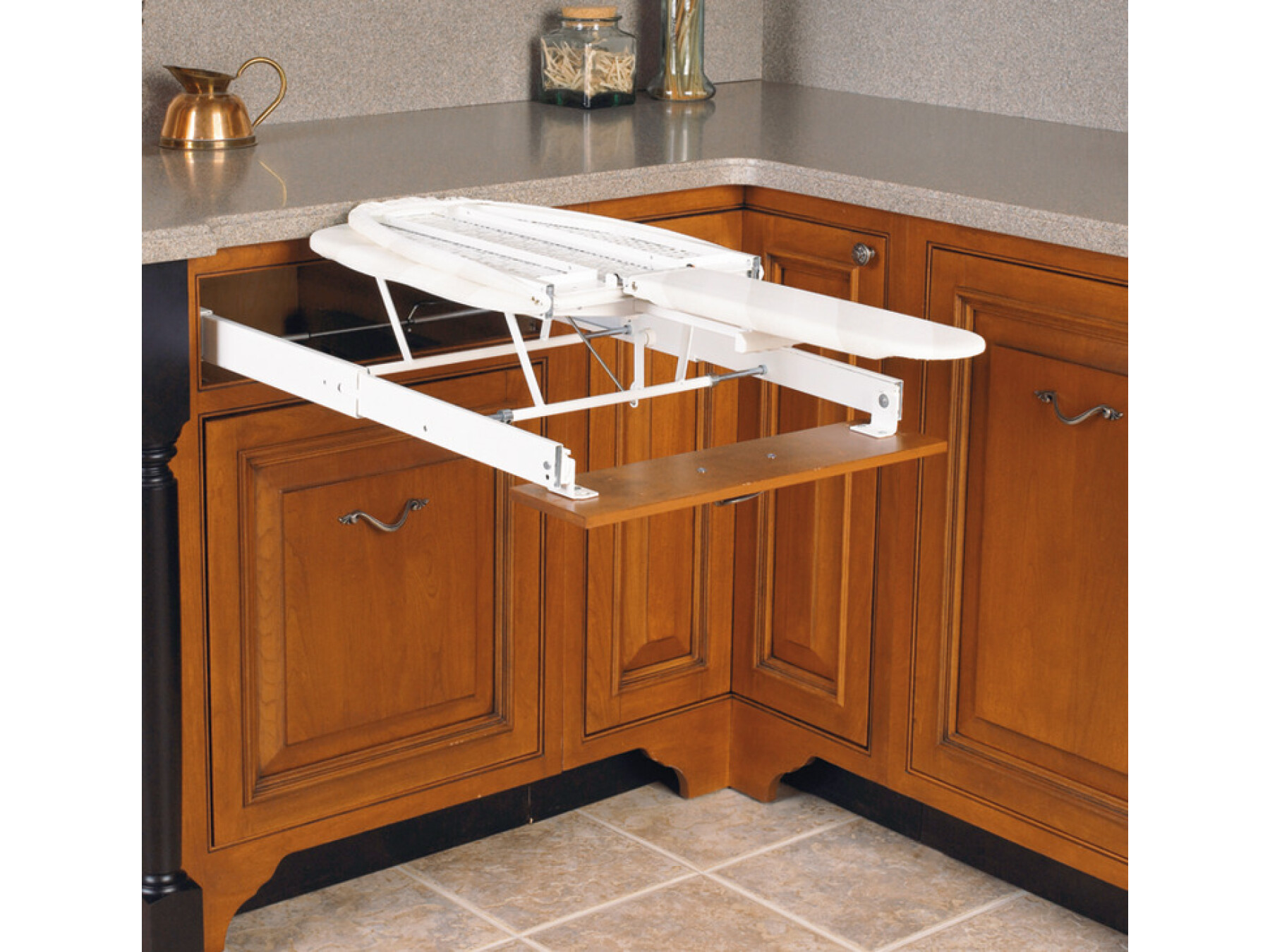 The entire ironing board is built into the drawer space of most standard base cabinets and can be accessed by simply pulling the drawer open and unfolding the board