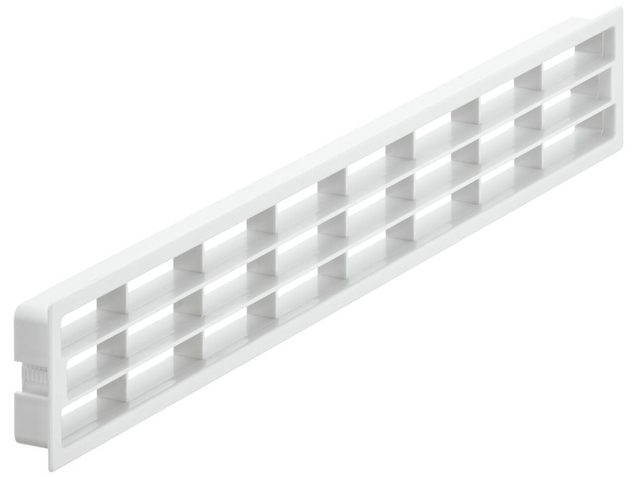 Ventilation Grille, Plastic, with Fixing Clips and with Louvres (Part No: 571.78.702) is the practical, clean-looking solution for controlled airflow in your kitchen ventilation setup. Designed for seamless integration, this Over 200 cm² ventilation area, White finish, length 400 mm vent grille helps support efficient ventilation while maintaining a tidy, modern appearance.