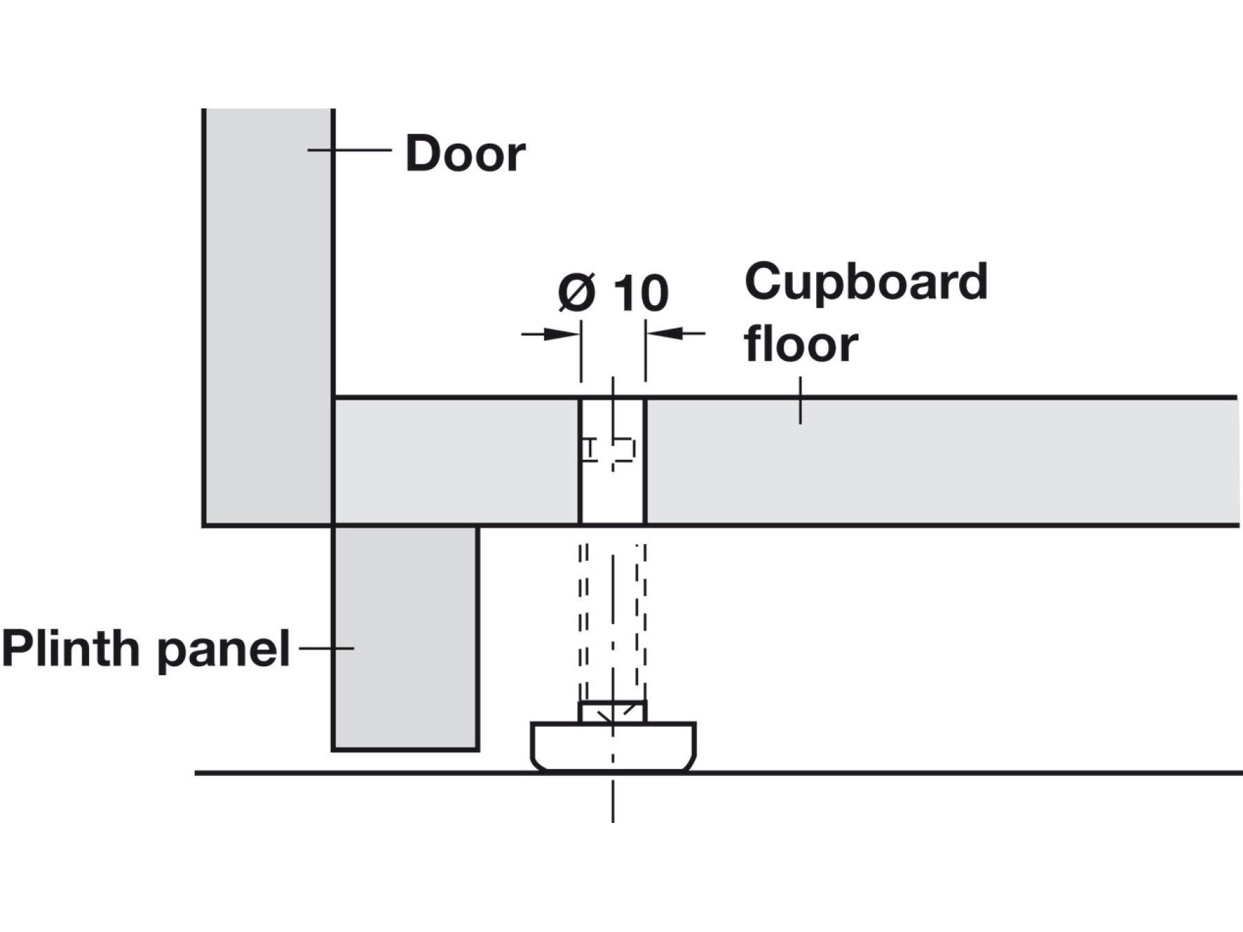 Adjustable from above through ⌀ 10 mm aperture in cupboard floor and from below with SW 8 open-ended wrench